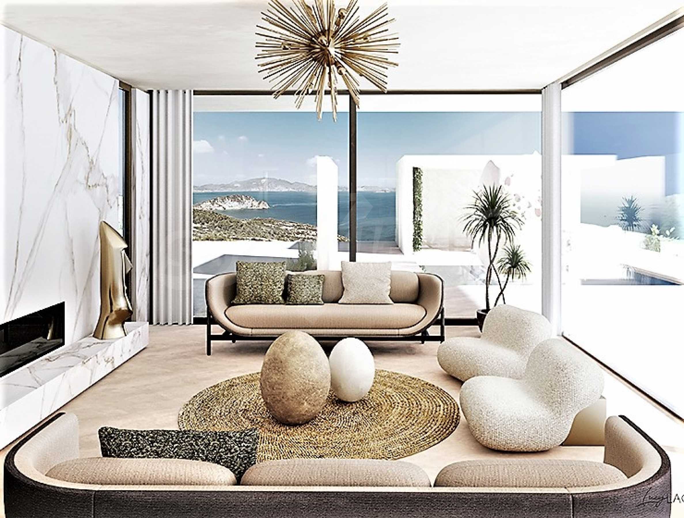 Villa Gaia is designed taking into account the climate, the trajectory of the sun and the prevailing wind direction and is combined with the beauty of the landscape. The architect has focused entirely on the human scale, from the design of the landscape to the articulation of the building, from the spaciousness of the interior to the smallest detail of the materials. Infinity pool is 18 meters by 5 meters and a depth of 1.60 meters, with sun loungers. This is the perfect place to sit and enjoy the sea, garden or mountain views with a cocktail in hand. Milky pink colors, sandy shades and textures, as well as the olive palette predominate in the furniture and in the overall interior. The EGG sculpture is the dominant composition. The villa consists of a series of corners, a place to sit in the calm morning watching the sunrise, a place to gather with the whole family for lunch in the cool shade and wind, a place for contemplation under a hundred-year-old olive tree, a place to drink a glass of wine at the end on the day with friends overlooking the landscape of Lagana Bay.