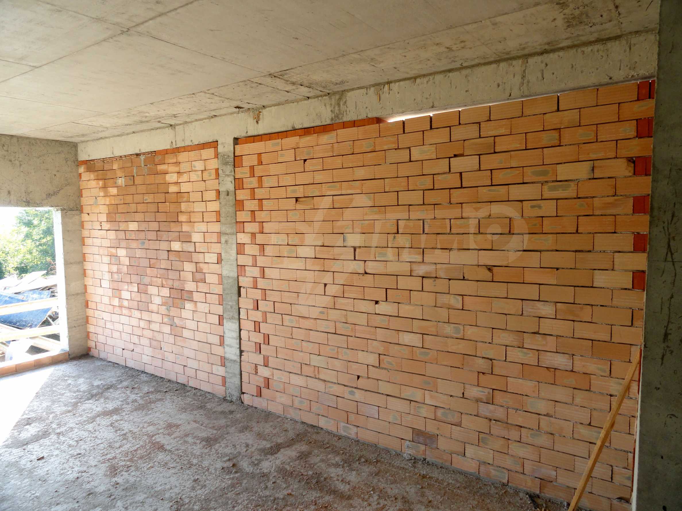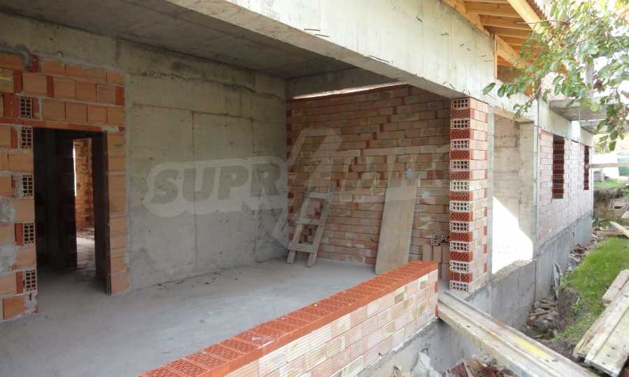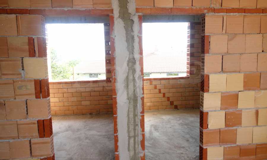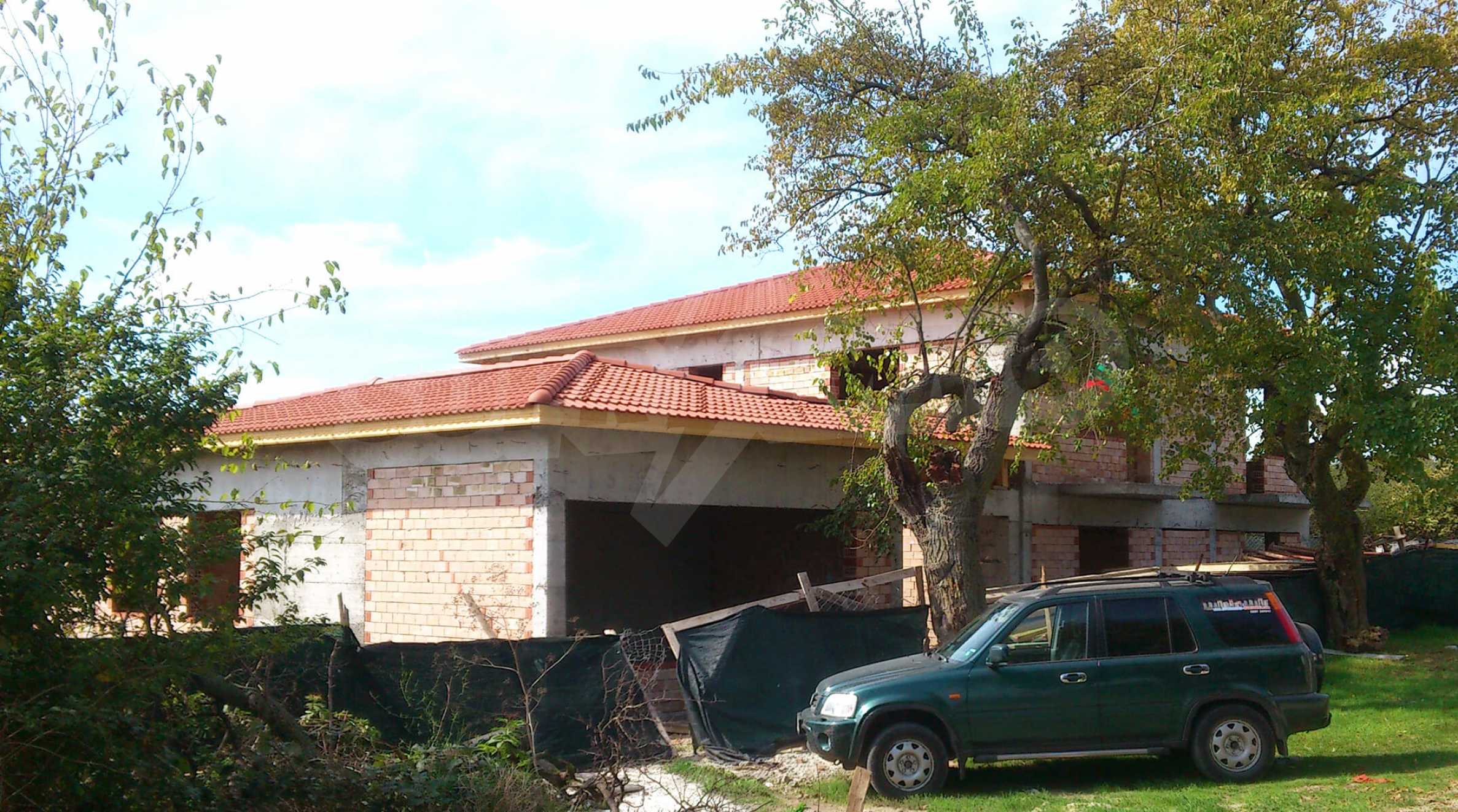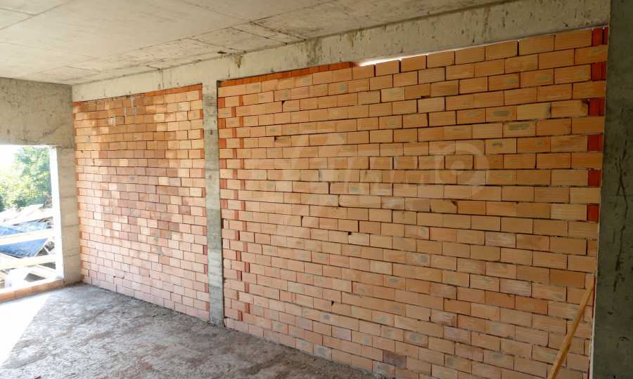 The building is finished in rough construction - reinforced concrete structure (columns and slabs), brick walls, sloping roof with tiles.