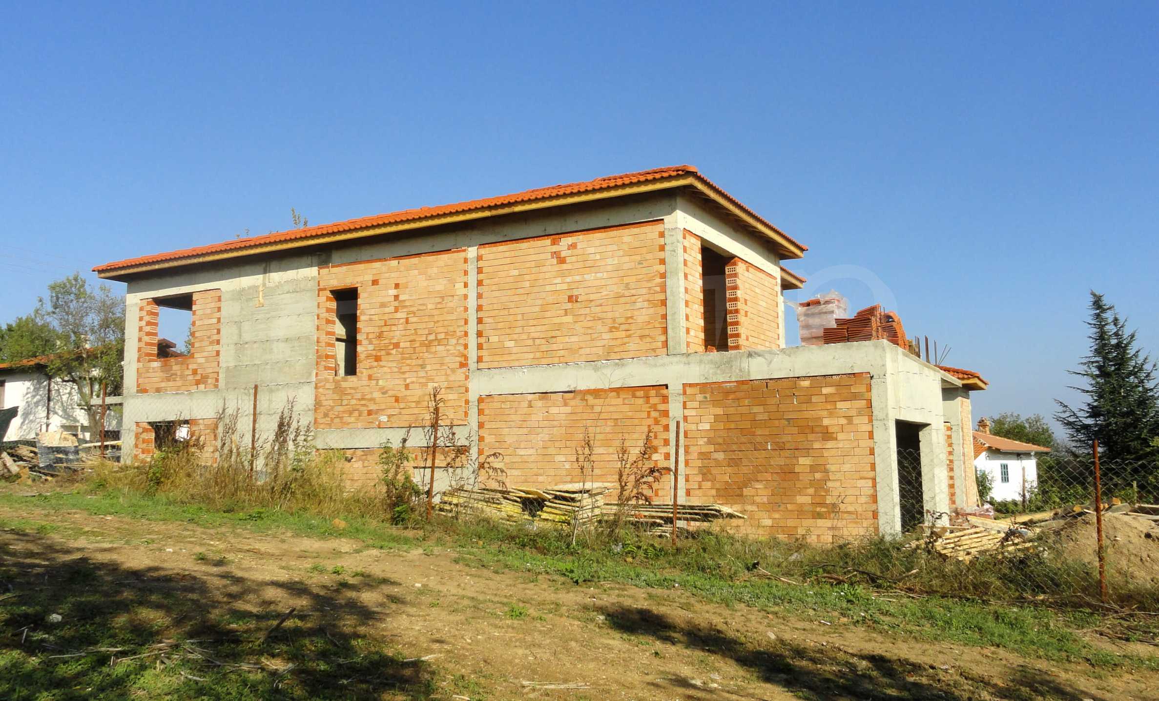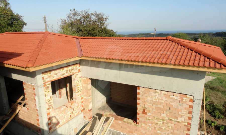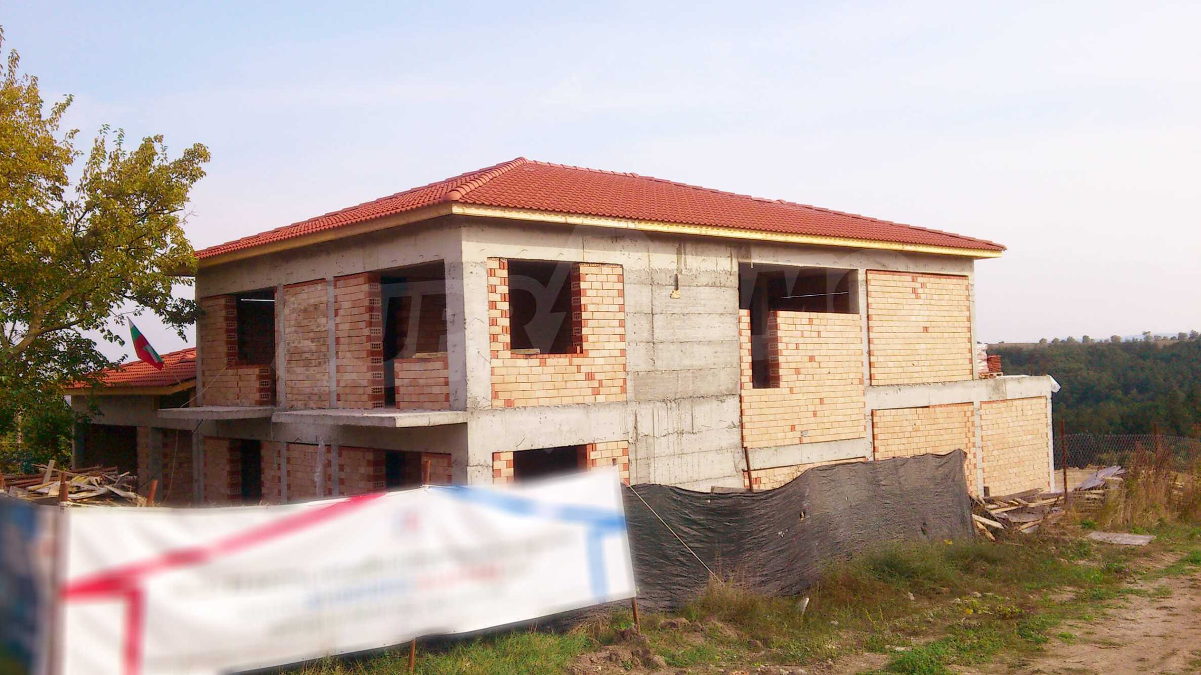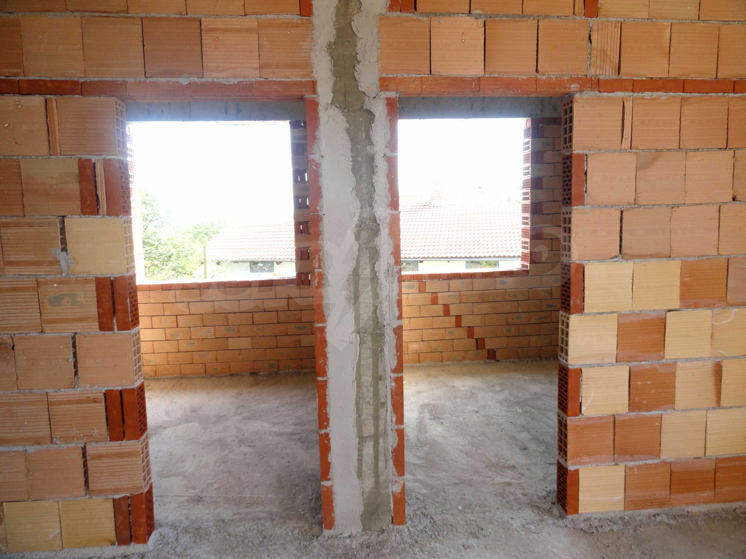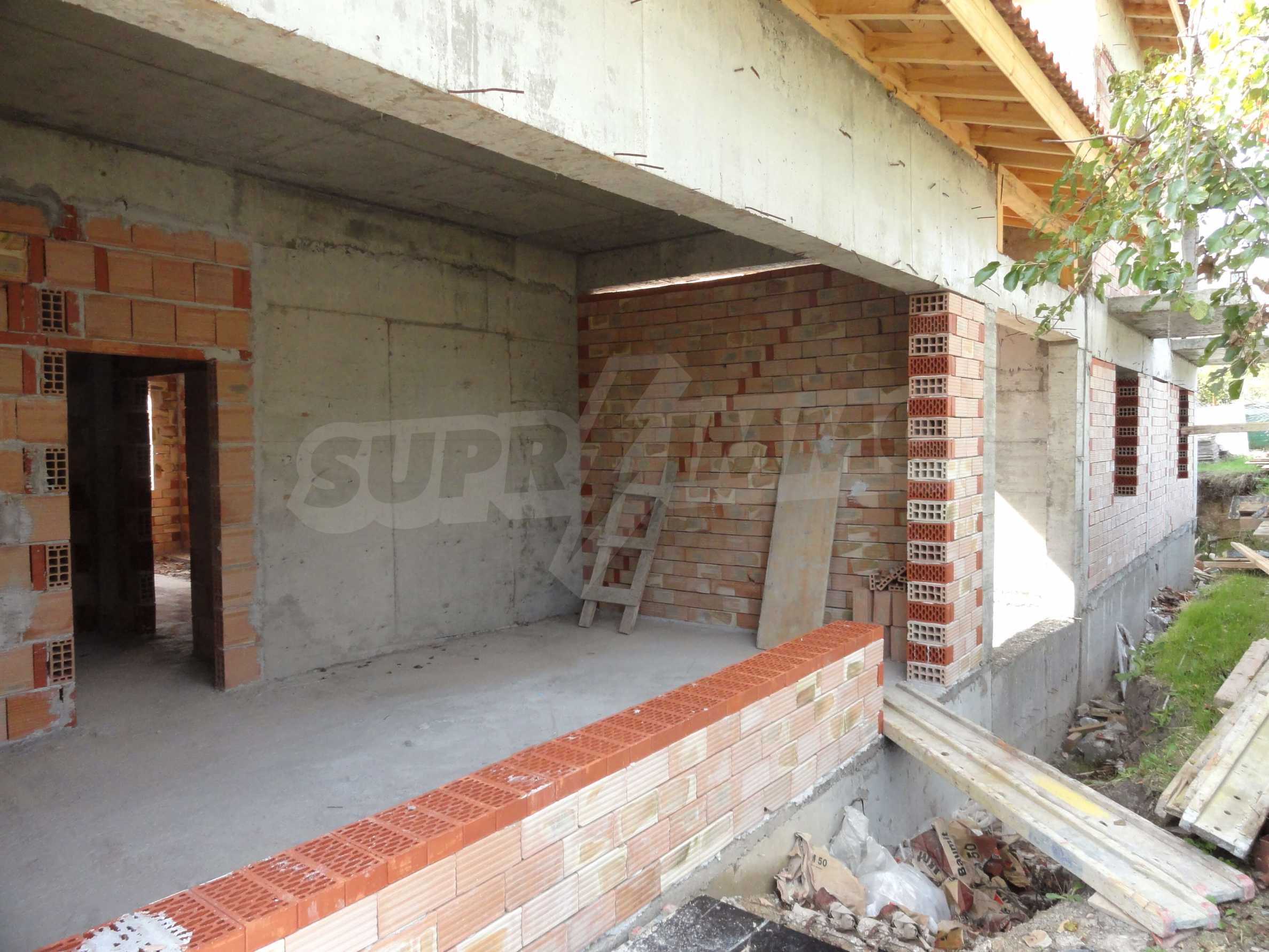 The building is finished in rough construction - reinforced concrete structure (columns and slabs), brick walls, sloping roof with tiles.
