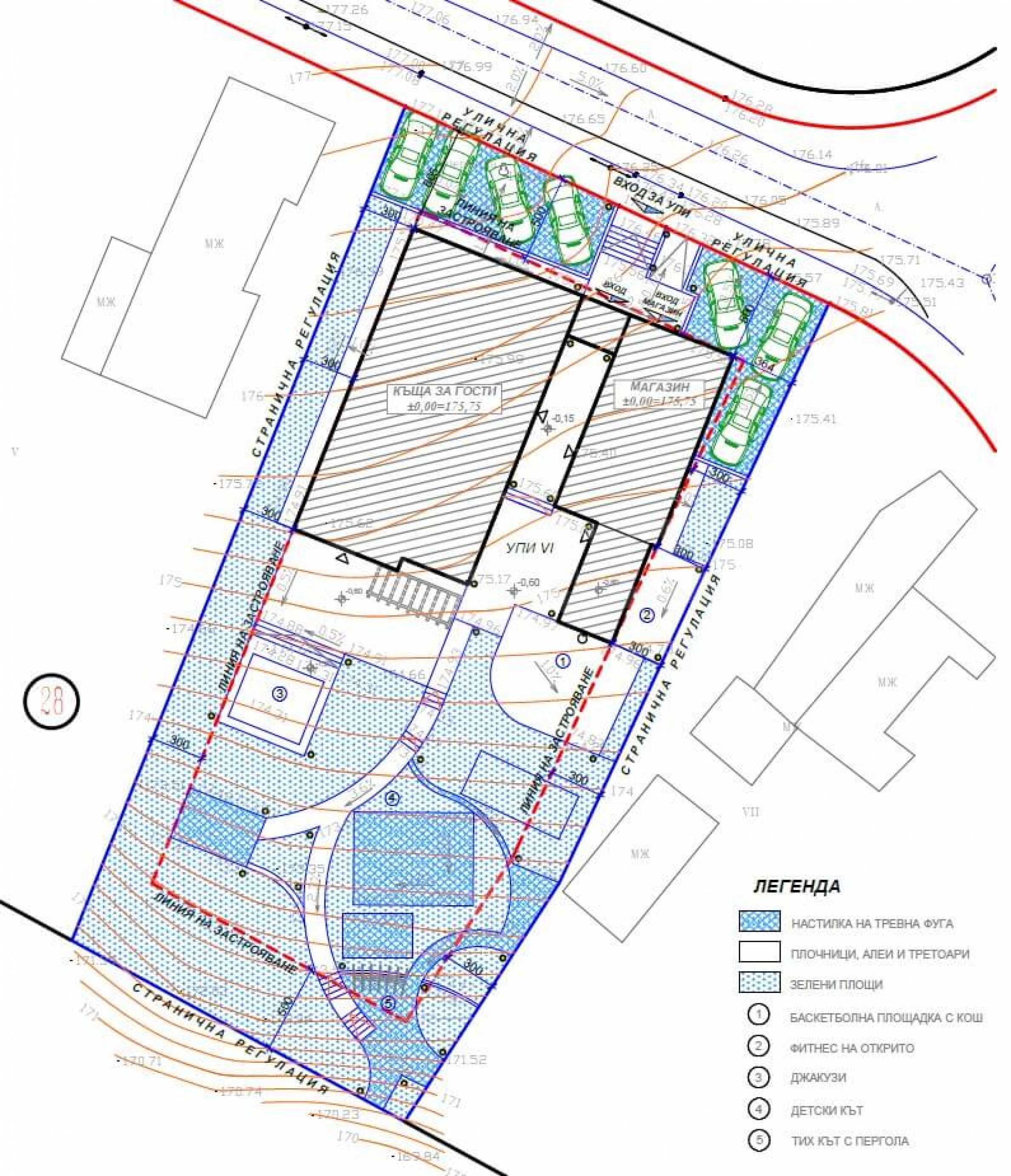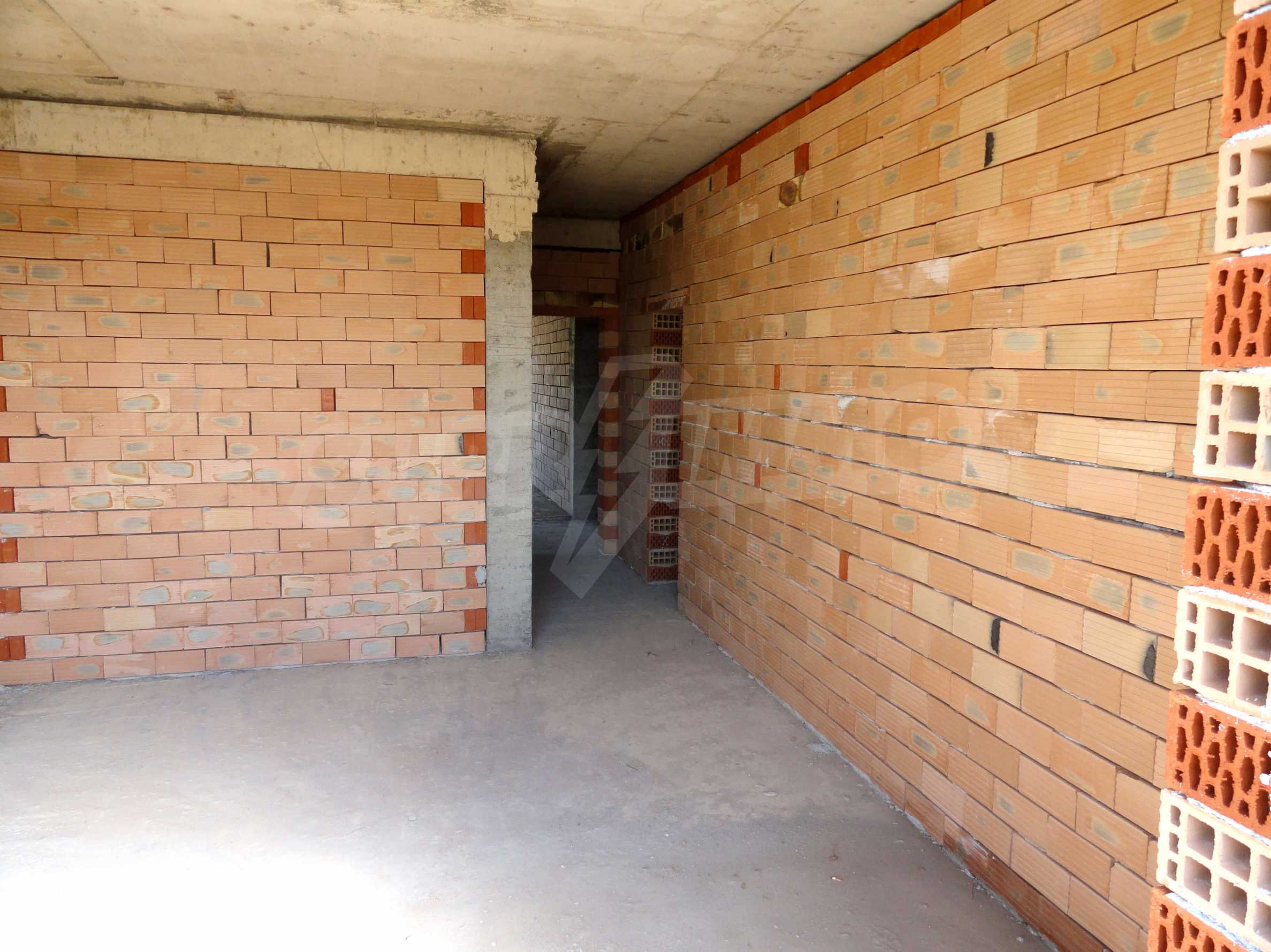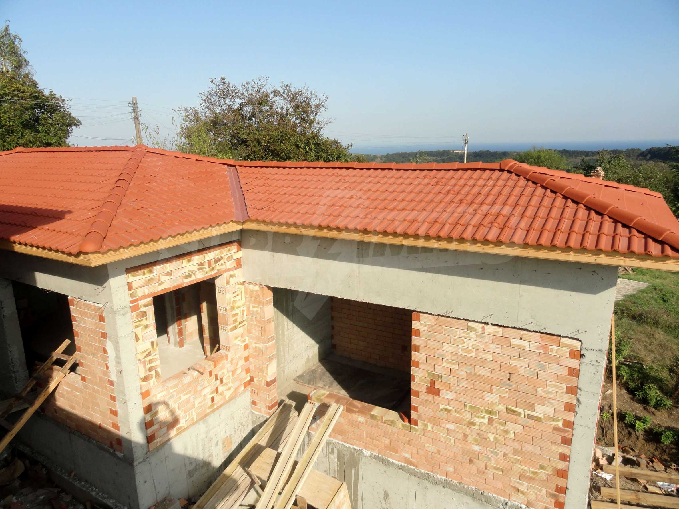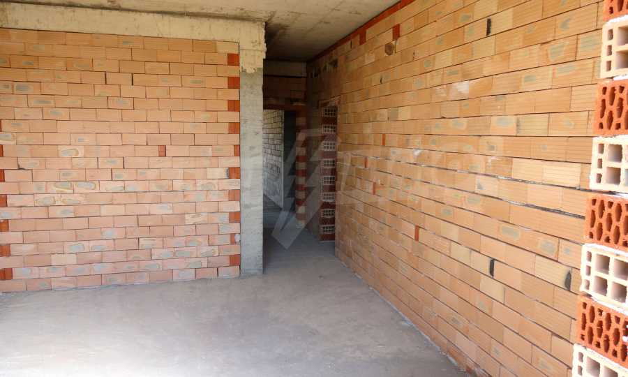 The building is finished in rough construction - reinforced concrete structure (columns and slabs), brick walls, sloping roof with tiles.