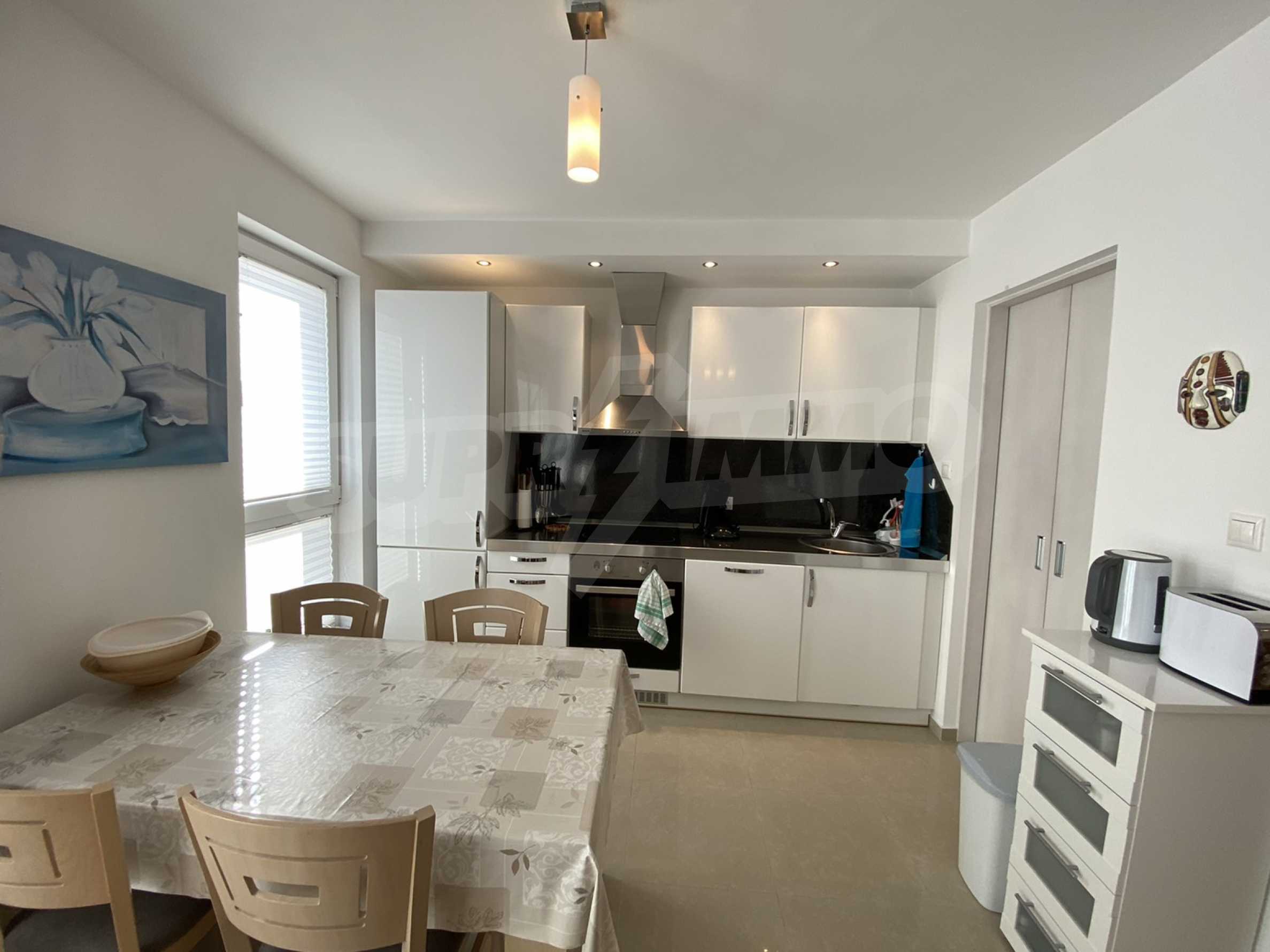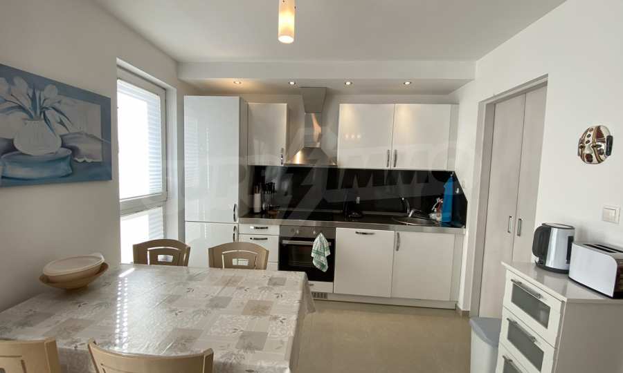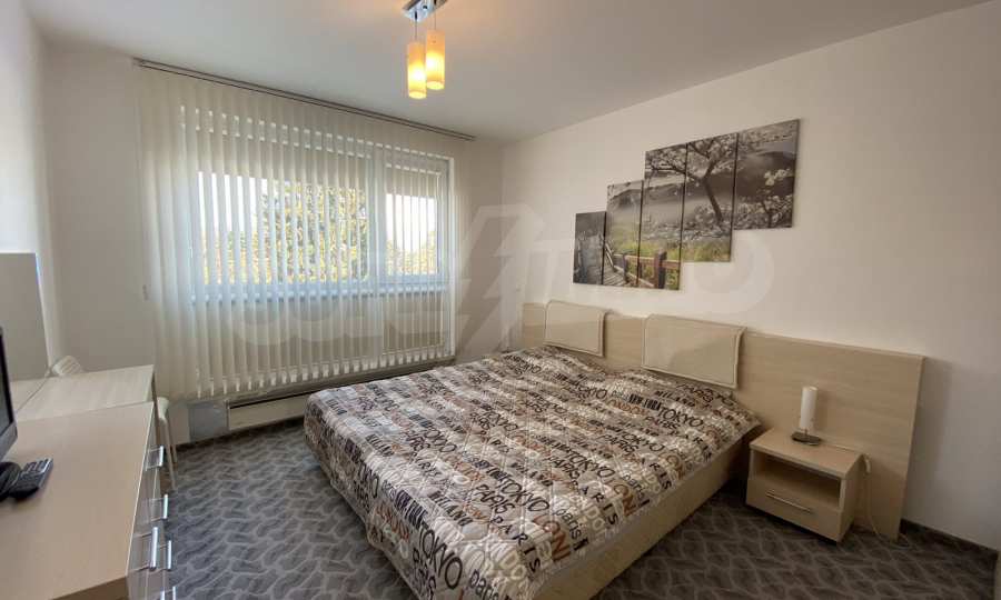 The apartment (2006 year of construction), with south and east exposure and mountain views, located on the 3th floor with an total area of 97 sq. m. Fully equipped kitchen includes hood, sink, refrigerator, kettle, toaster. Living room - sofa, armchair, TV, coffee table, TV stand, Wi-Fi, telephone, dining table, 4 chairs, blinds. Bedroom 1: double bed, 2 bedside tables, double wardrobe. Bedroom 2: double bed, 2 bedside tables, a double wardrobe, bathroom with toilet.