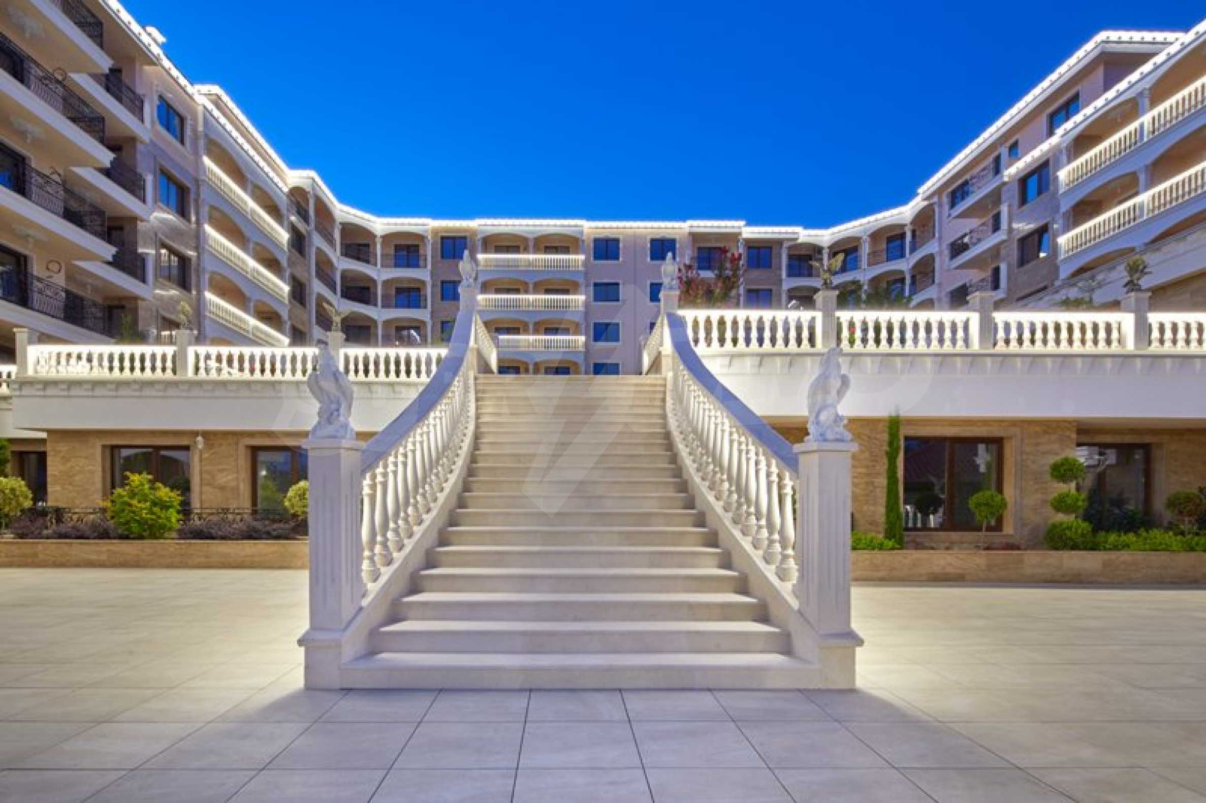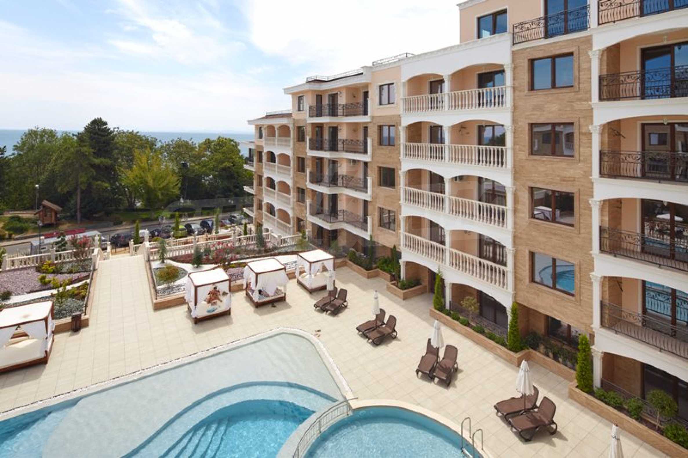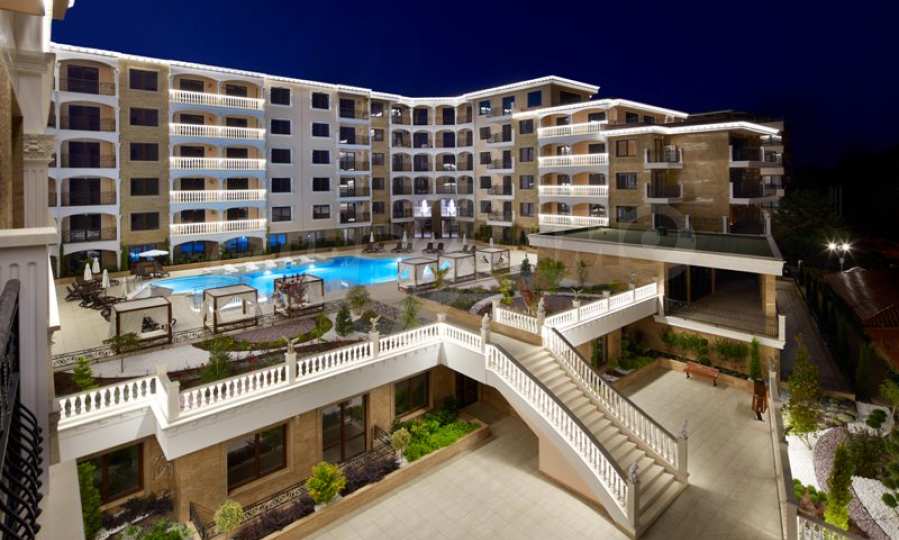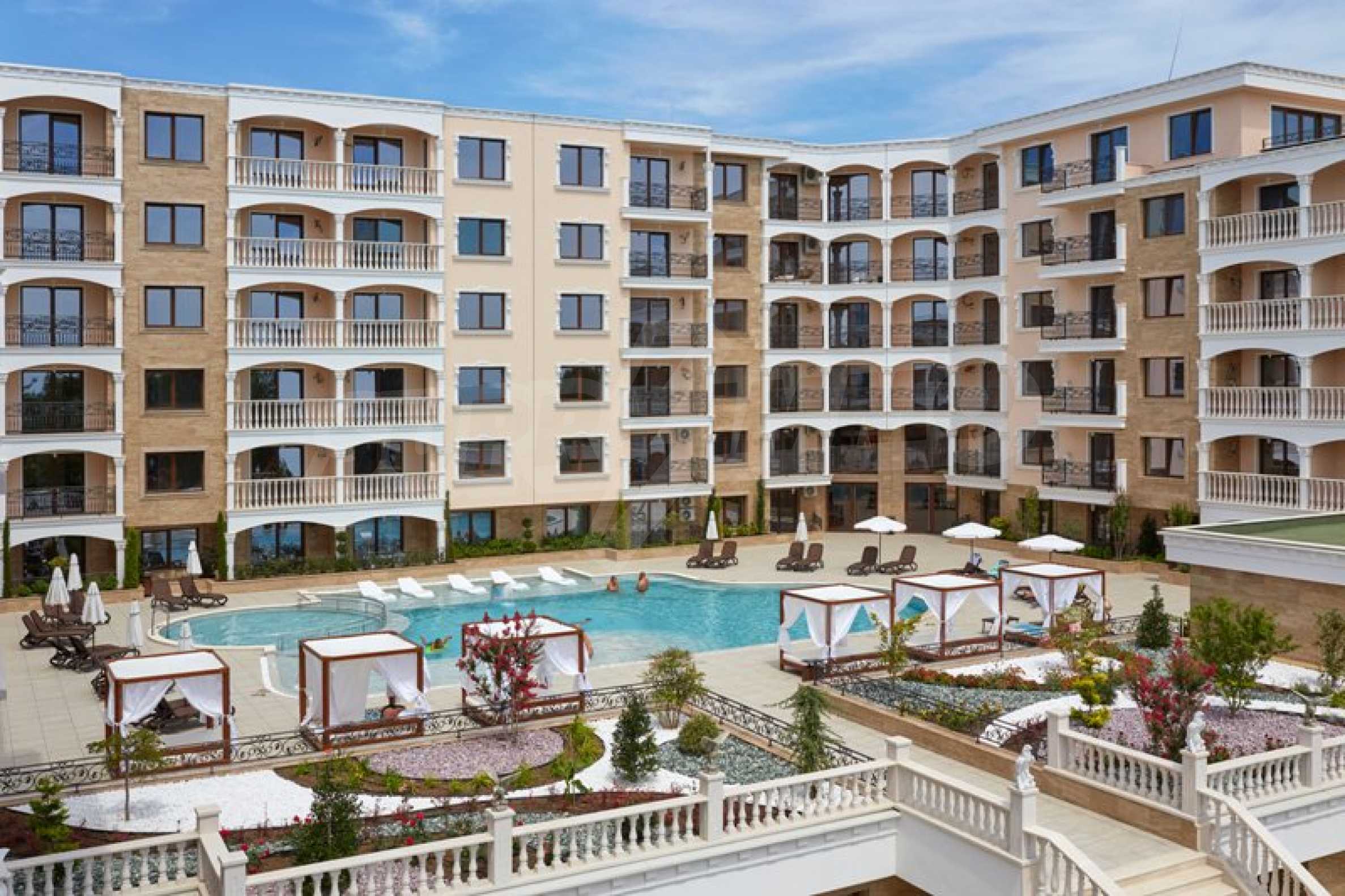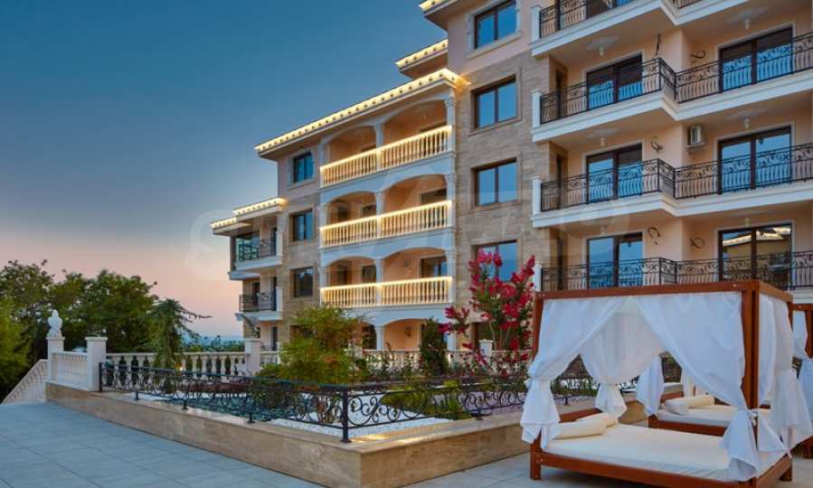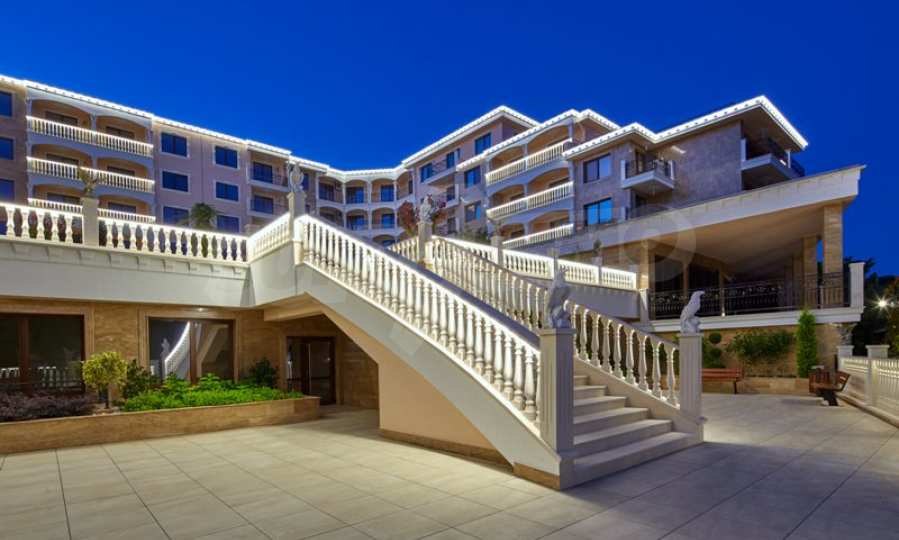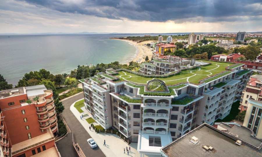 Located in the southern part of the popular resort, the distinctive complex stands out with sophisticated, modern architecture, with classic Mediterranean notes - natural stone, wrought iron elements and balusters, combined with rich landscaping both on the territory and on the roof of the building. The strategic location on the beach provides a remarkable, frontal view of the sea all year round, and the proximity to the city park makes this complex ideal for family living and comfortable recreation with children. The apartments in this complex are suitable for living and rest, as well as for investment.