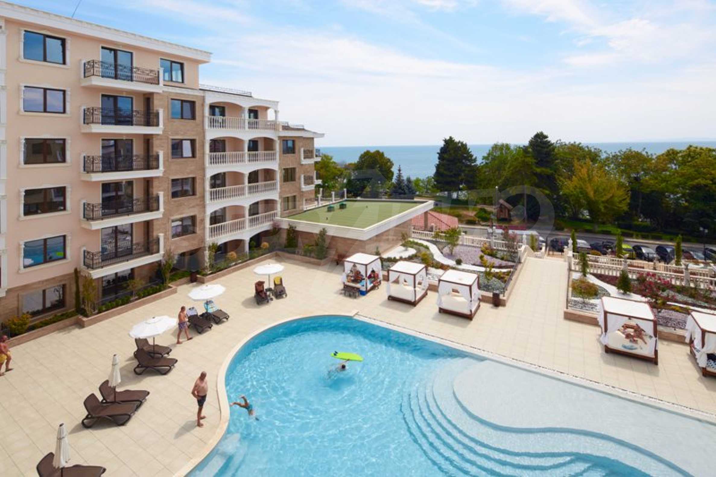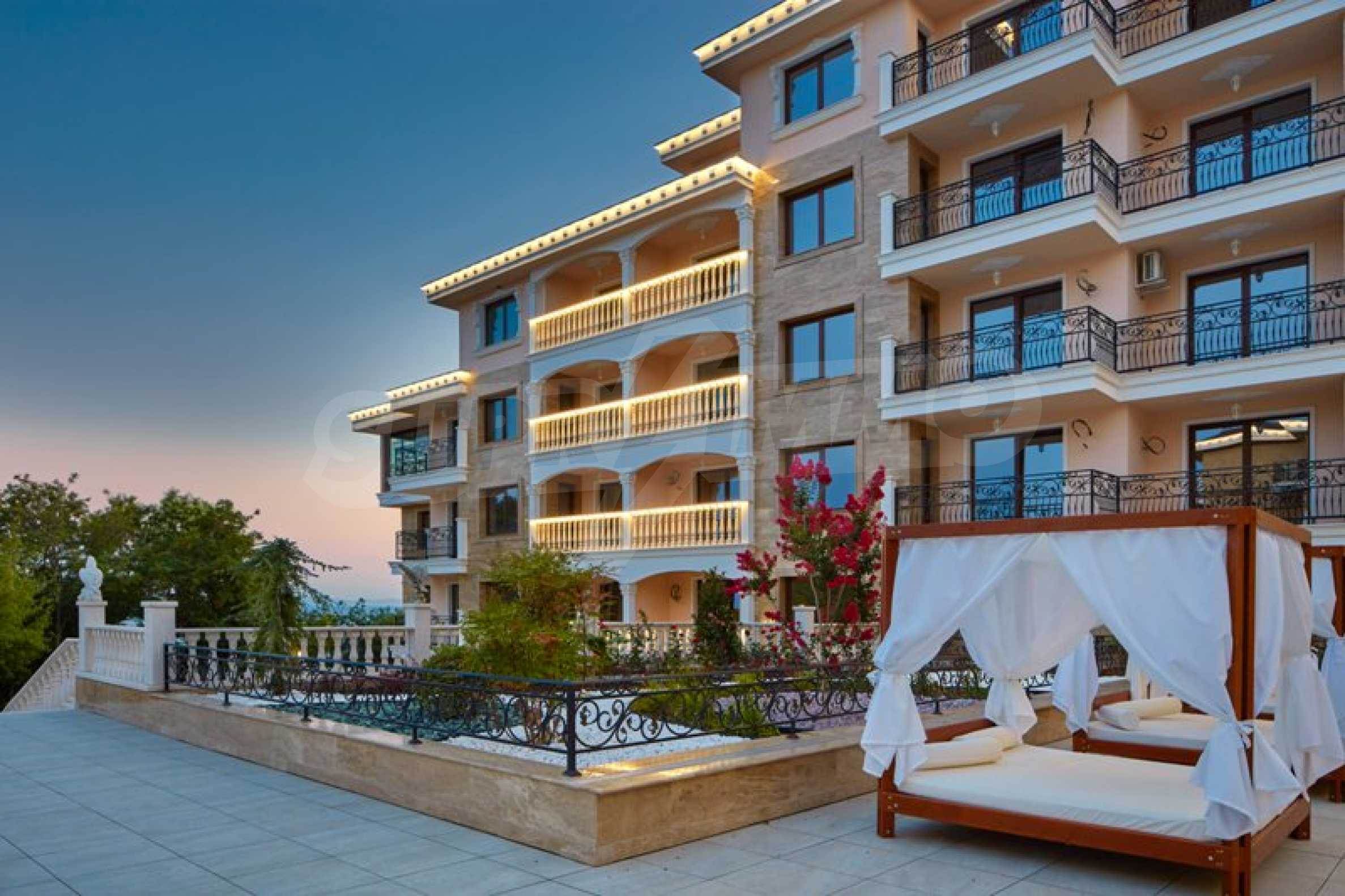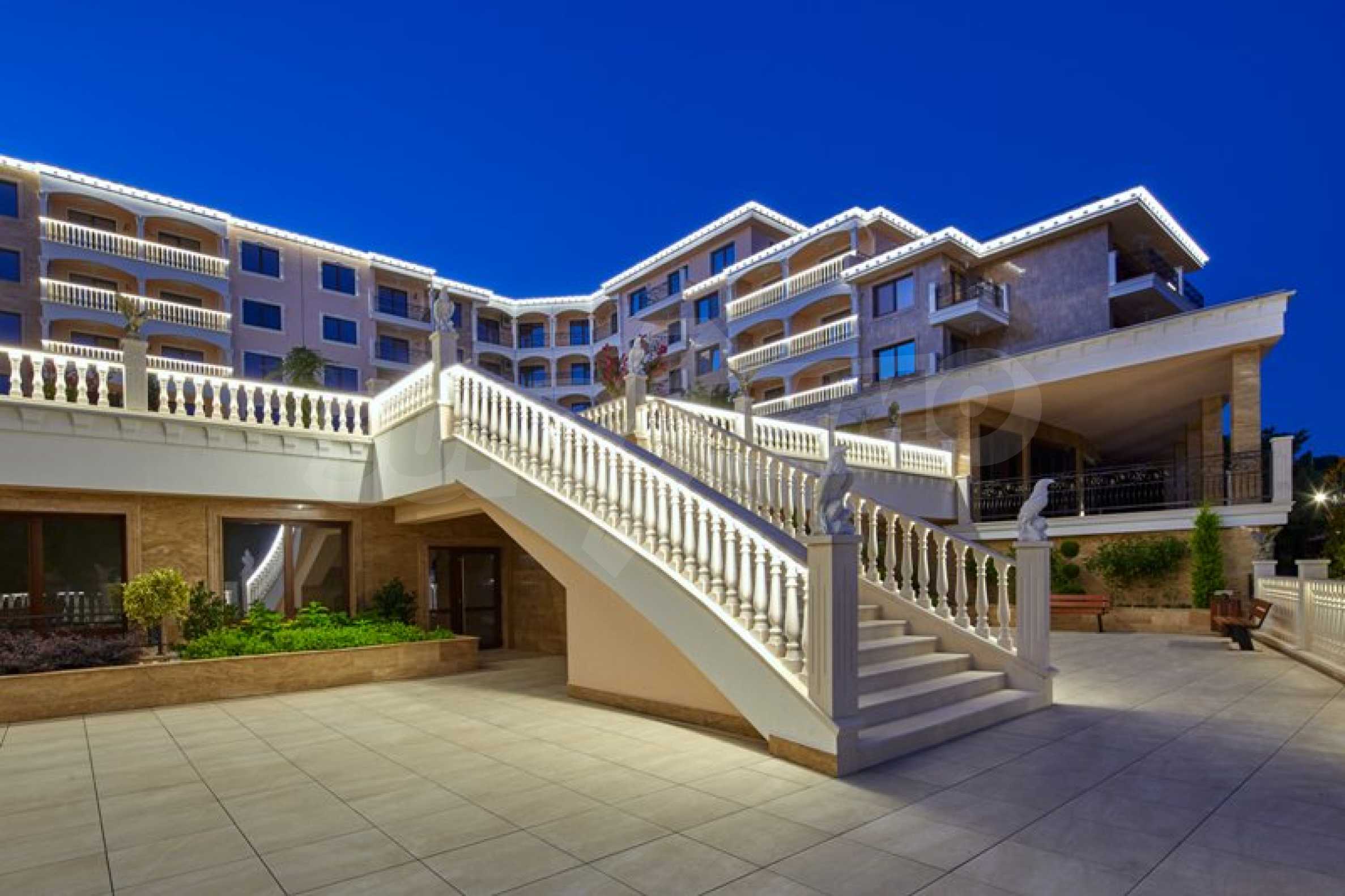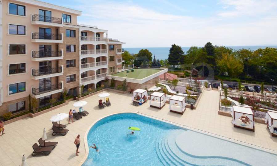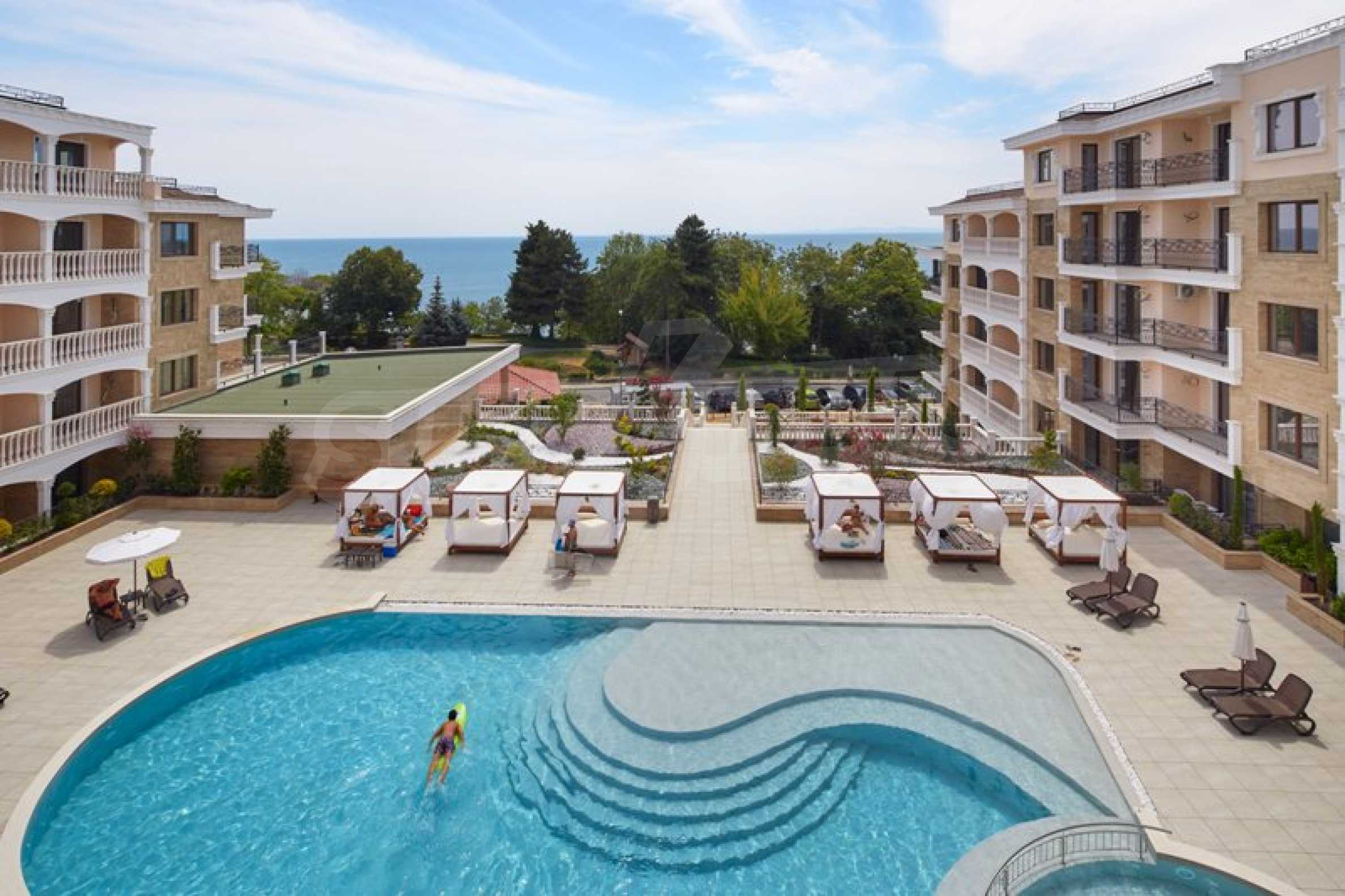 Located in the southern part of the popular resort, the distinctive complex stands out with sophisticated, modern architecture, with classic Mediterranean notes - natural stone, wrought iron elements and balusters, combined with rich landscaping both on the territory and on the roof of the building. The strategic location on the beach provides a remarkable, frontal view of the sea all year round, and the proximity to the city park makes this complex ideal for family living and comfortable recreation with children. The apartments in this complex are suitable for living and rest, as well as for investment.