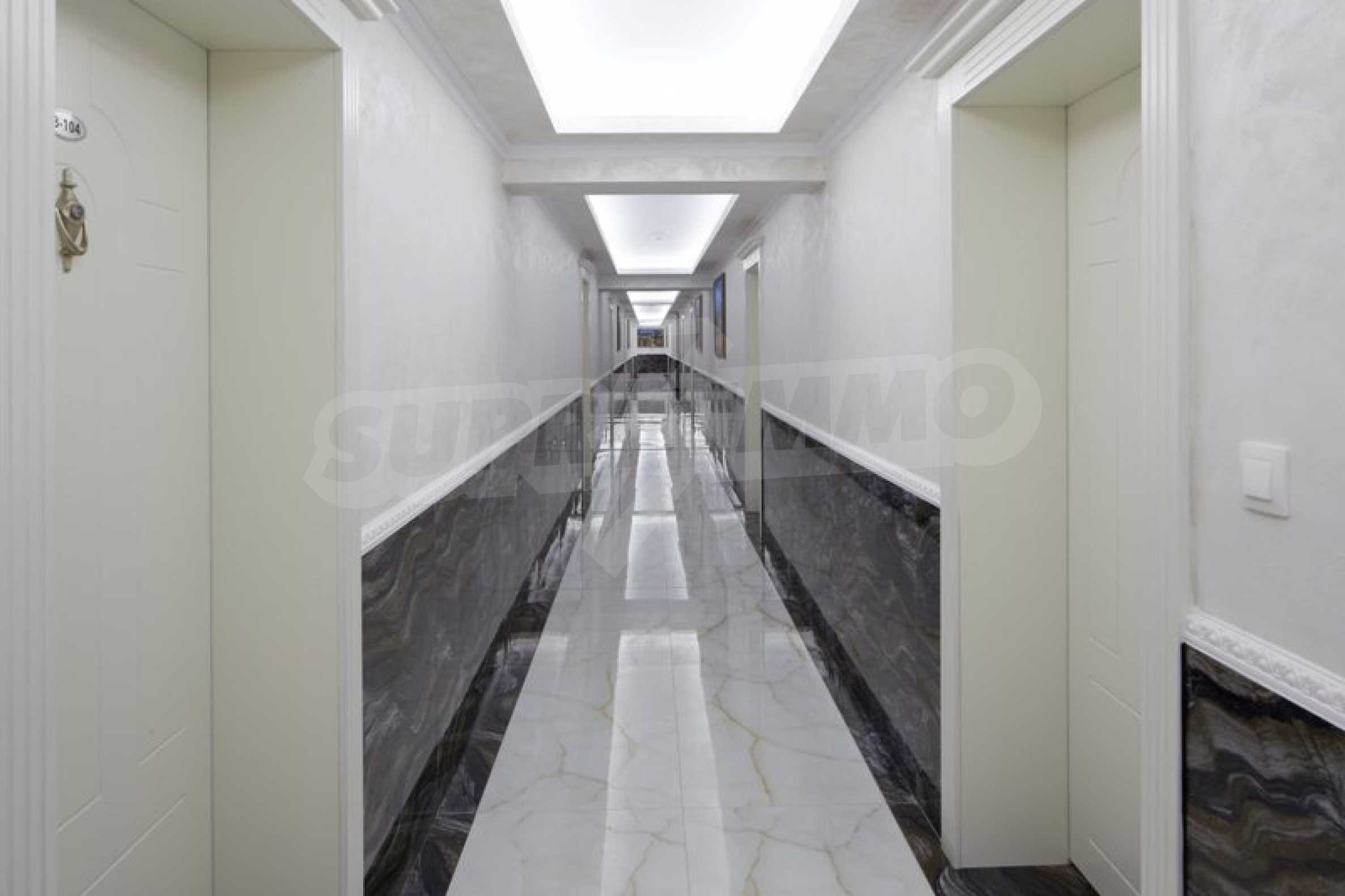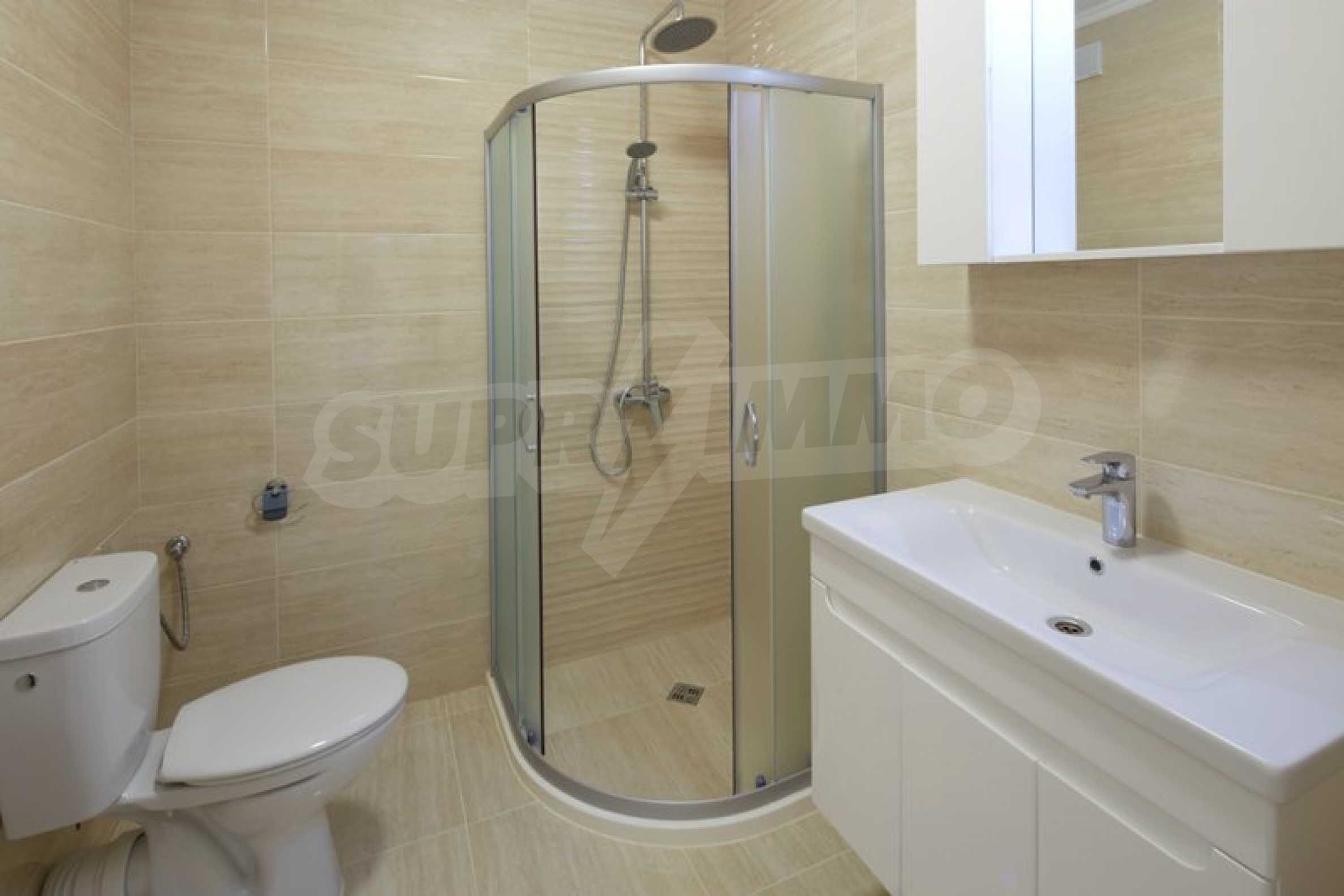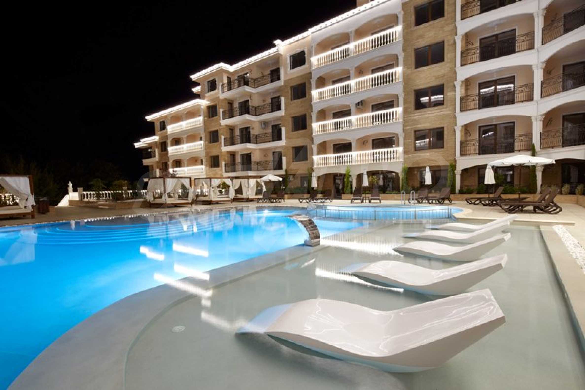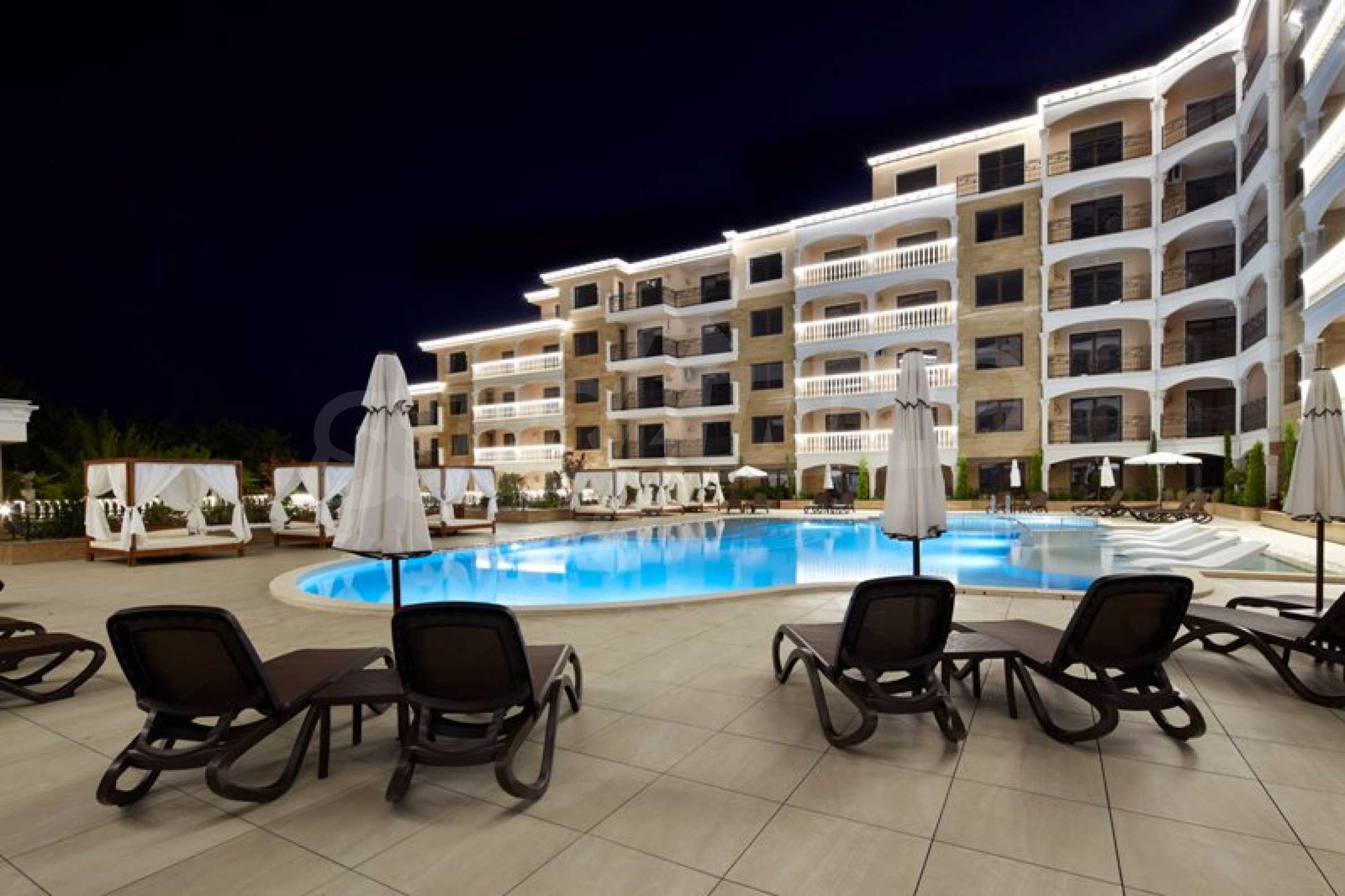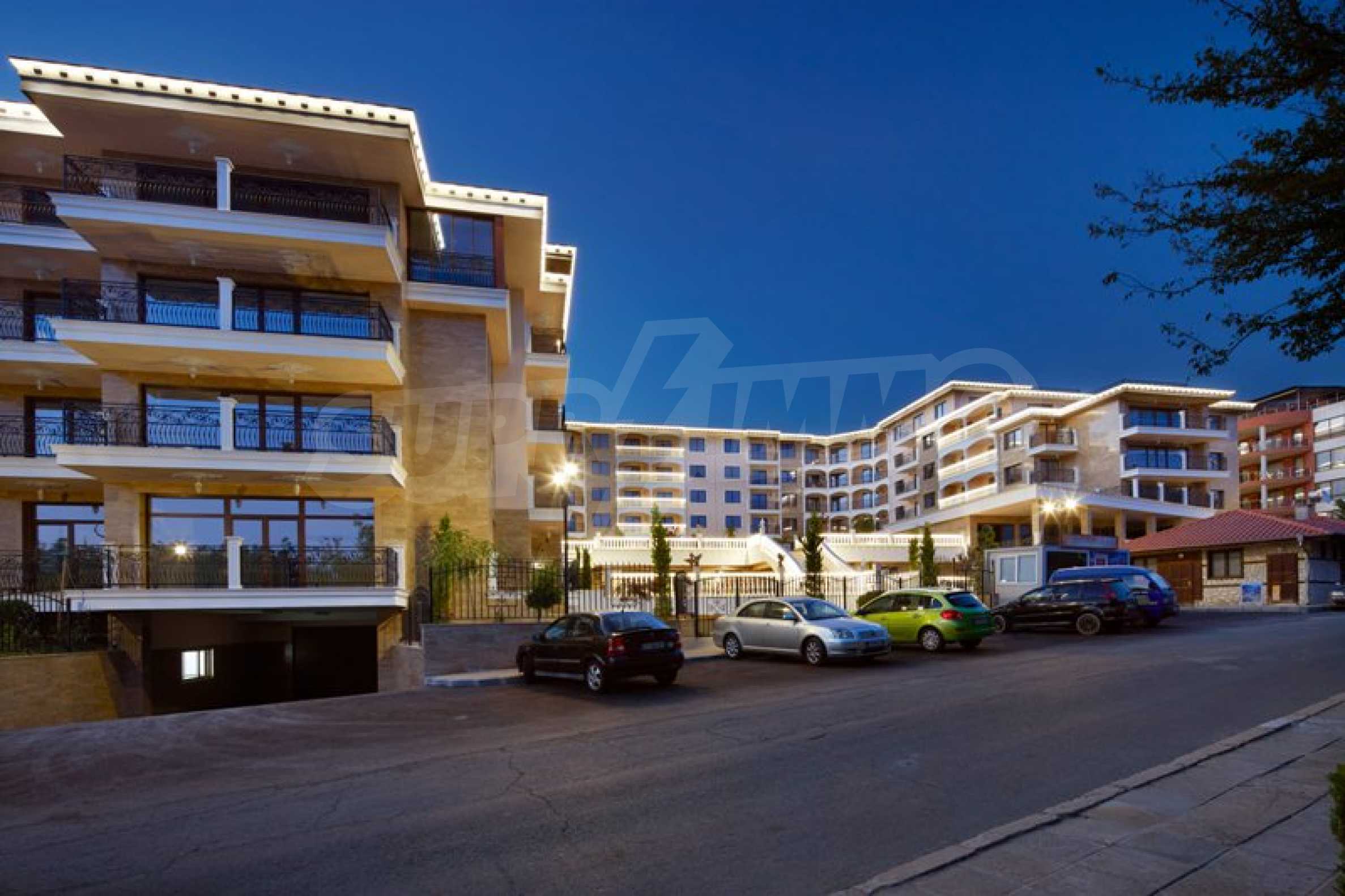 Located in the southern part of the popular resort, the distinctive complex stands out with sophisticated, modern architecture, with classic Mediterranean notes - natural stone, wrought iron elements and balusters, combined with rich landscaping both on the territory and on the roof of the building. The strategic location on the beach provides a remarkable, frontal view of the sea all year round, and the proximity to the city park makes this complex ideal for family living and comfortable recreation with children. The apartments in this complex are suitable for living and rest, as well as for investment.
