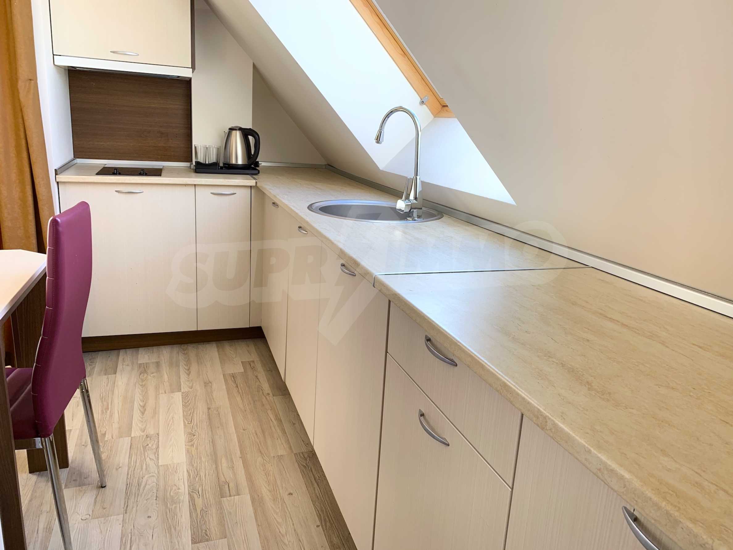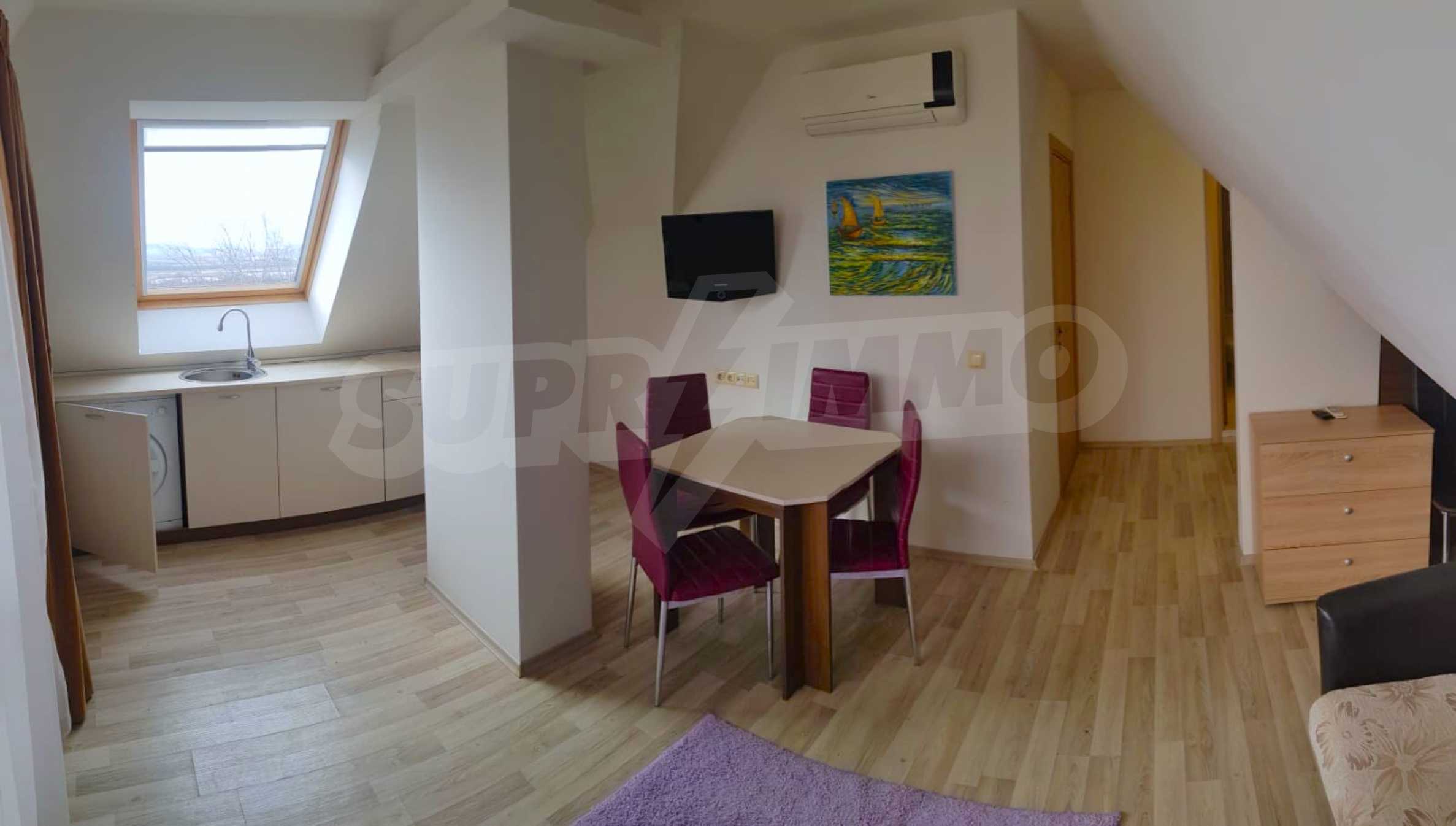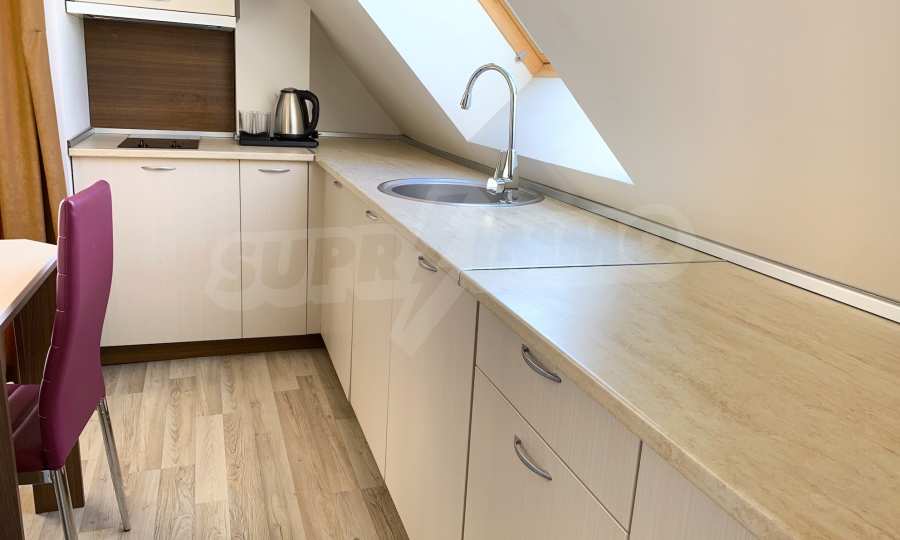 The property is a penthouse type, with a separate entrance. It consists of an entrance hall, a living room with a dining area, a large kitchen with built-in appliances, a utility room, a bright bedroom with a panoramic window overlooking the mountain, an equipped bathroom with a shower cabin, a balcony overlooking the pool and hills.