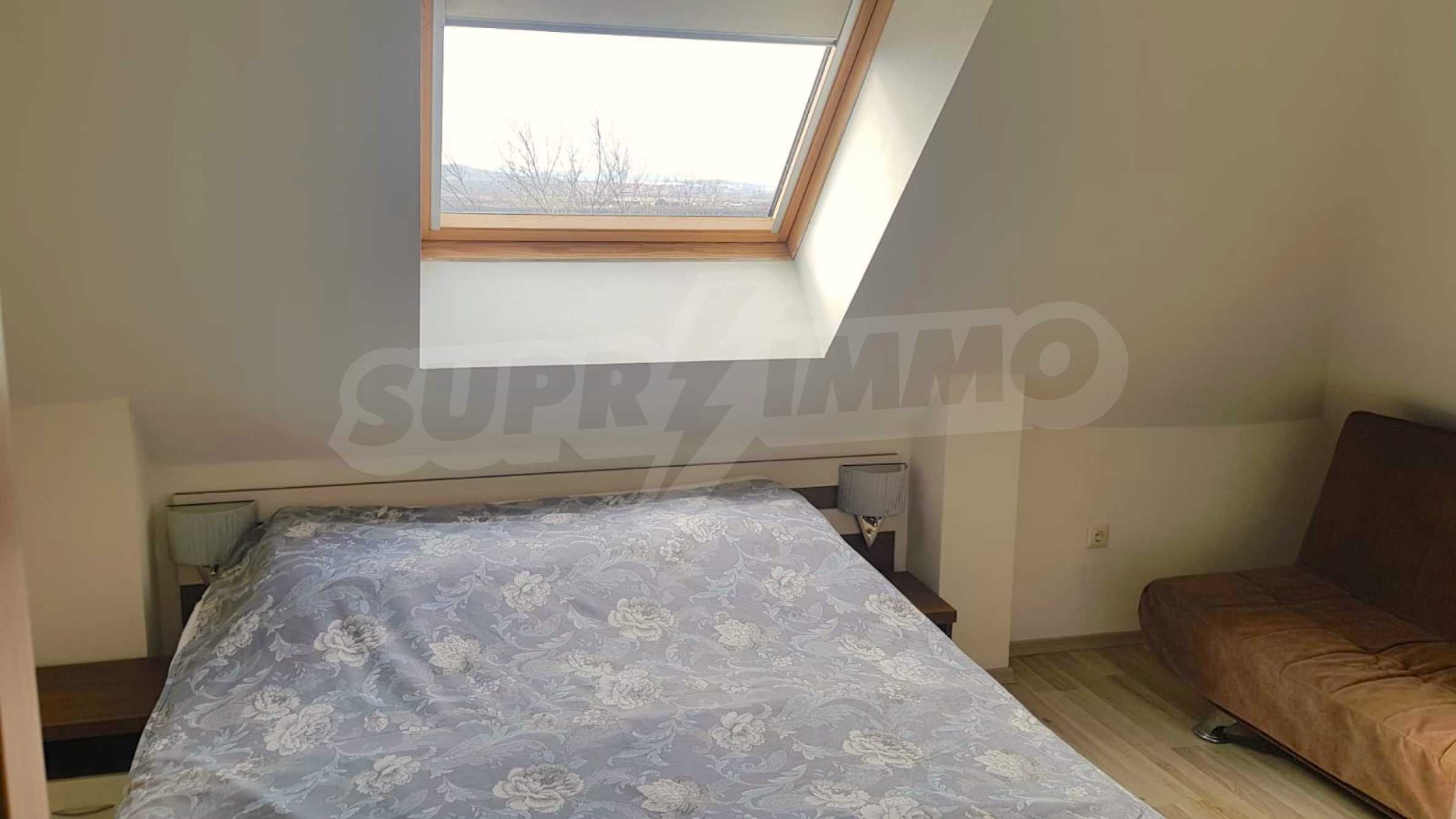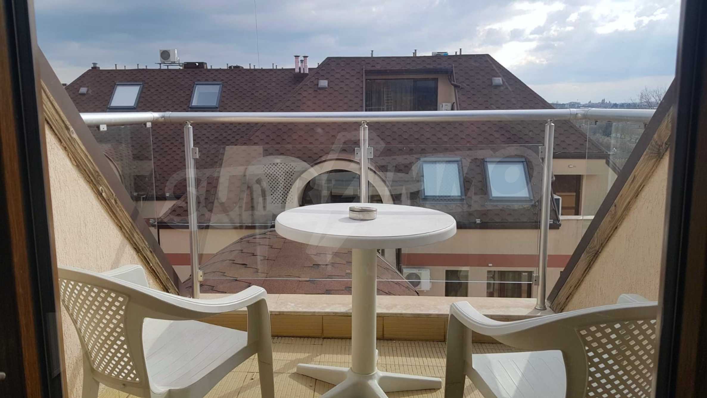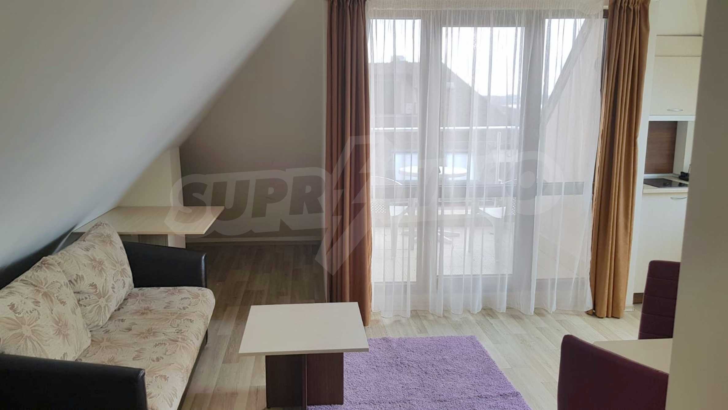 The property is a penthouse type, with a separate entrance. It consists of an entrance hall, a living room with a dining area, a large kitchen with built-in appliances, a utility room, a bright bedroom with a panoramic window overlooking the mountain, an equipped bathroom with a shower cabin, a balcony overlooking the pool and hills.
