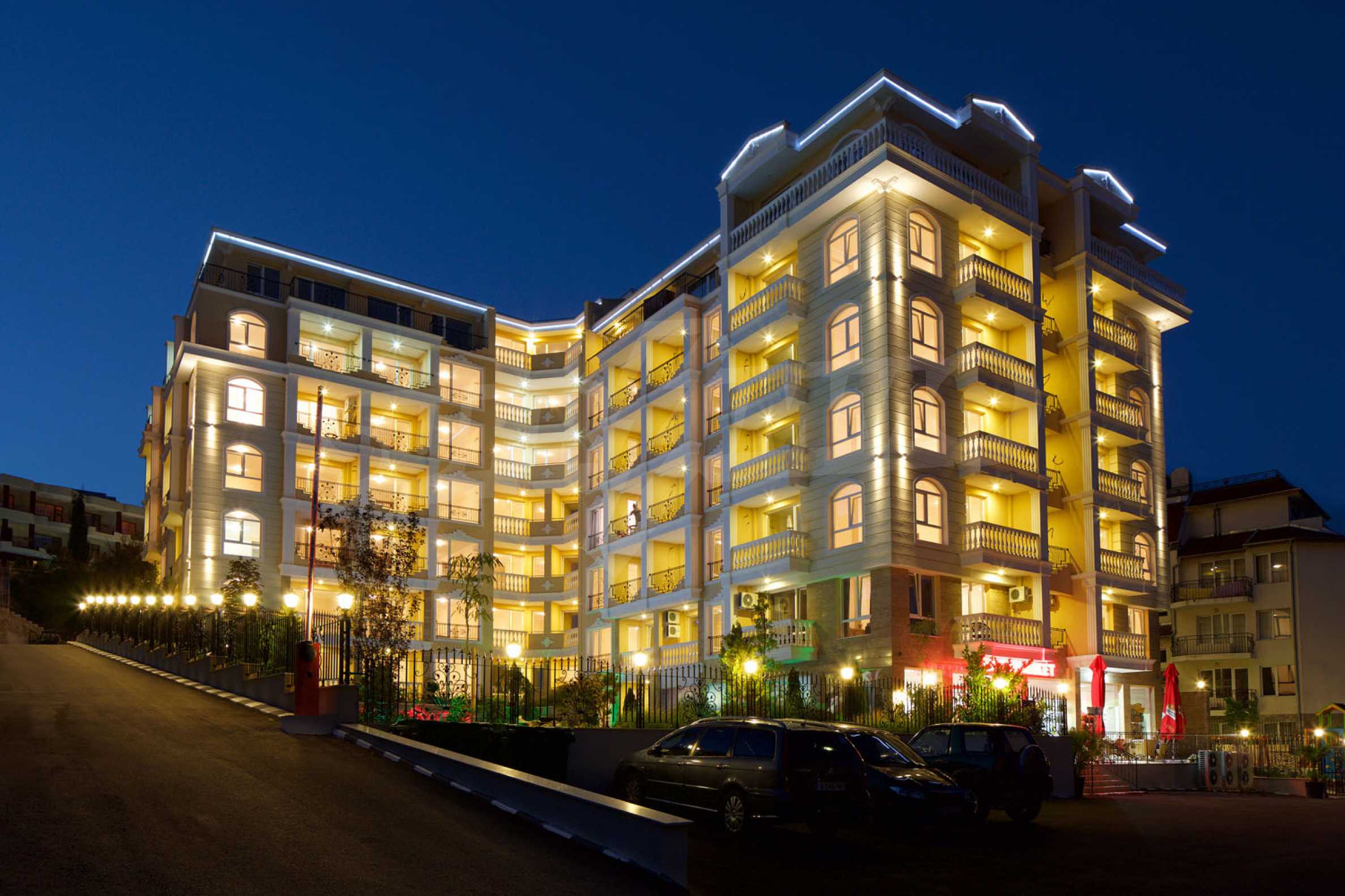 The exterior is decorated in light and sandy tones, with decorative facade elements and exquisite details, railings with wrought iron elements and stone balusters. The complex consists of 2 beautiful buildings with ground floor and 6 residential floors. The common areas are luxuriously finished, with suspended ceilings and the use of natural stone. The buildings are equipped with a modern elevator.