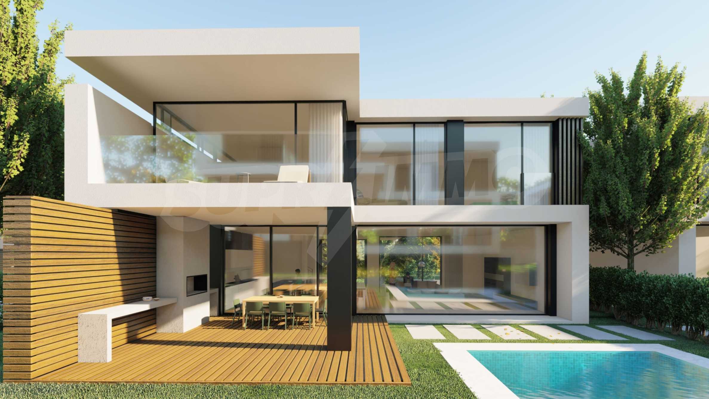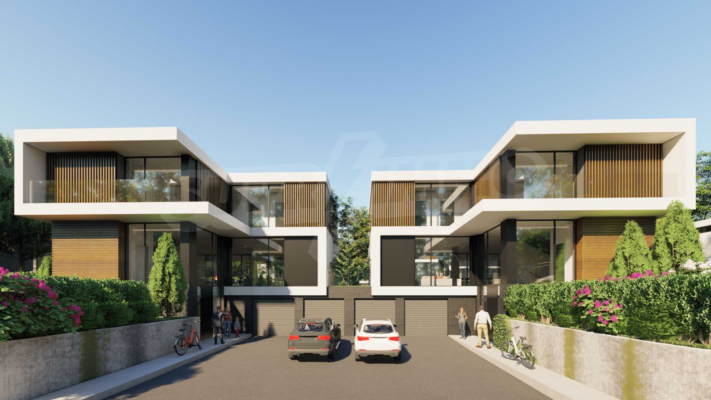 Yard: Each house has a separate yard for individual use, leveled, grassed, with an automated irrigation system installed. Built outdoor terrace with Artfino composite wood decking laid according to an architectural design and a barbecue area provided, with a chimney brought to the roof. Possibility of a pool.