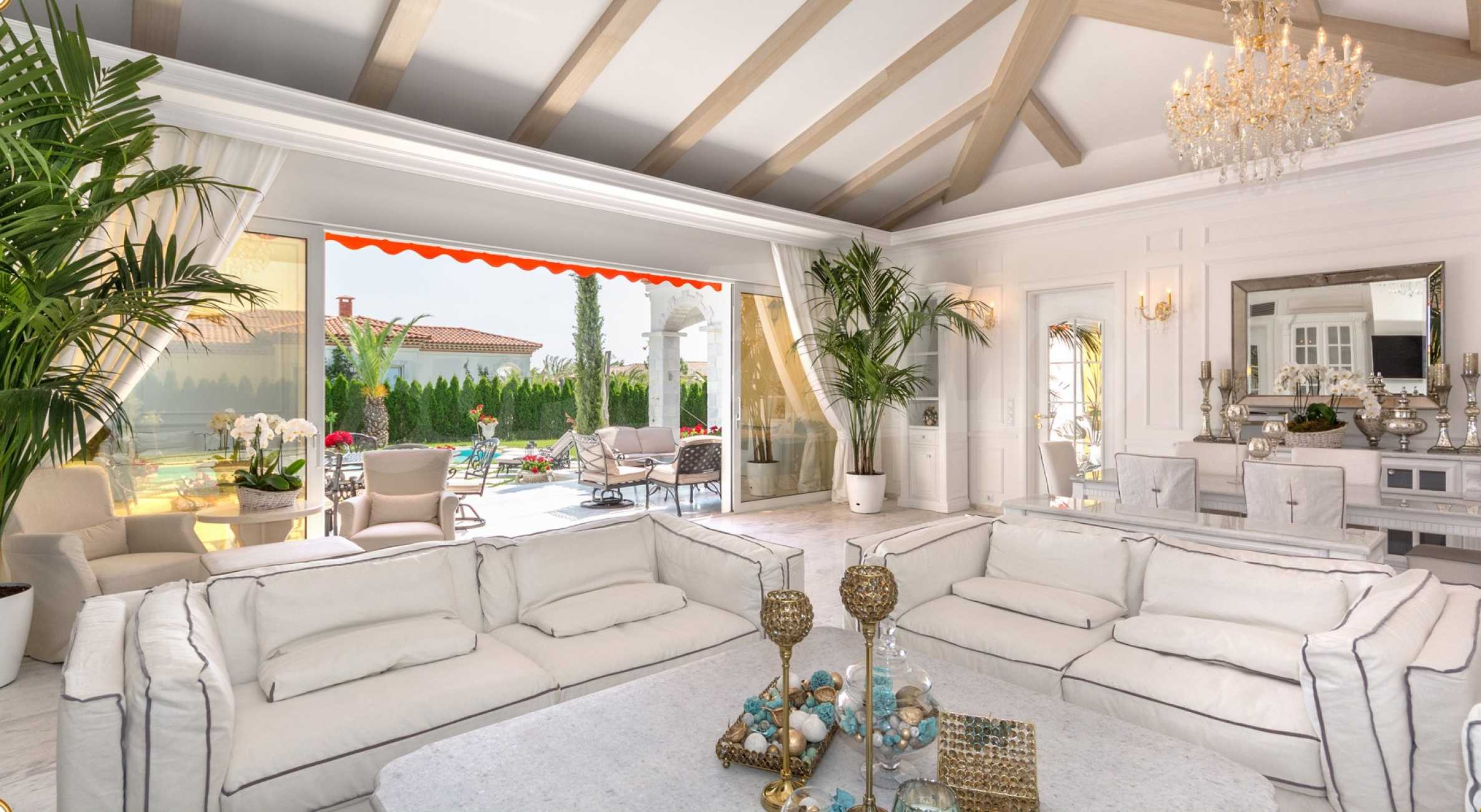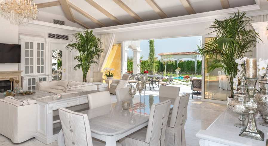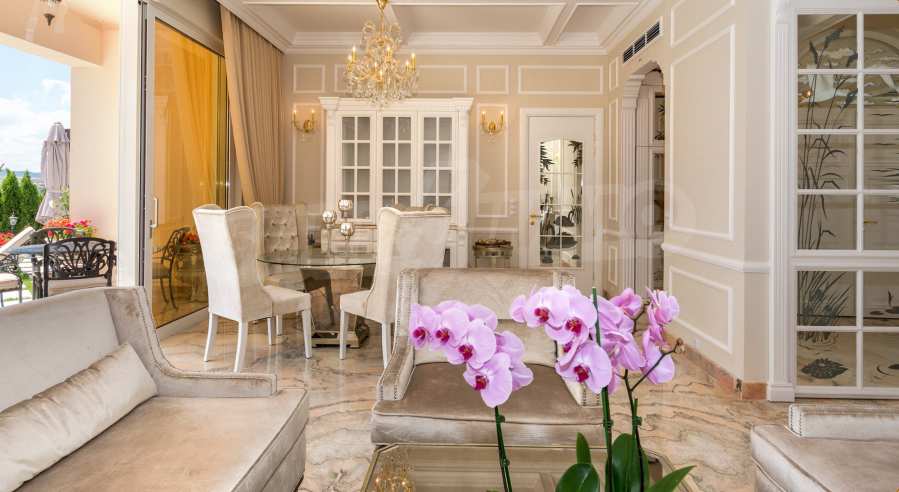 The villa is elegantly furnished, with entirely individually made furniture. The interior uses natural materials, marble and wood.