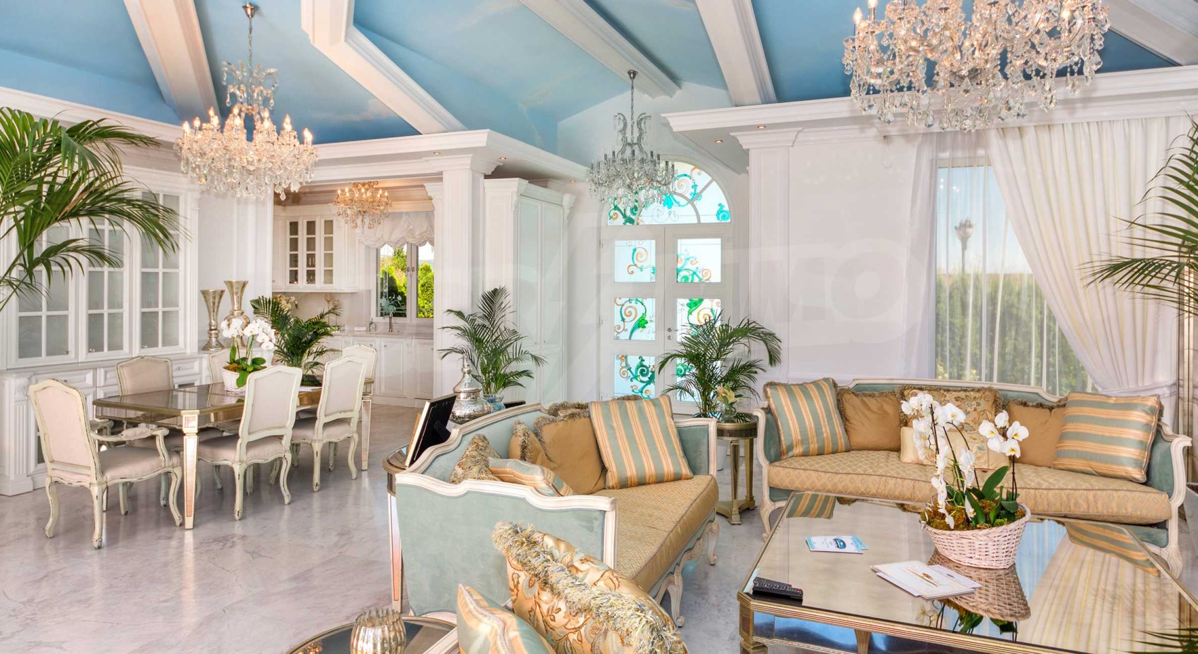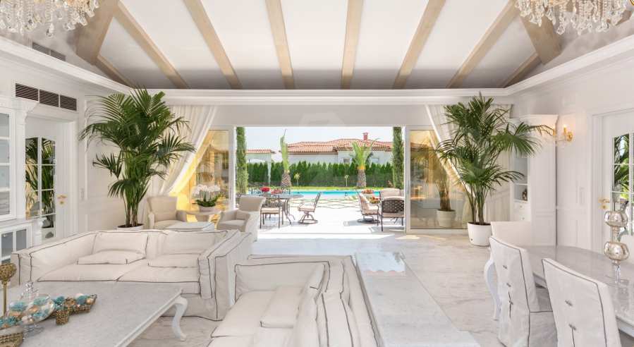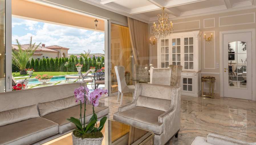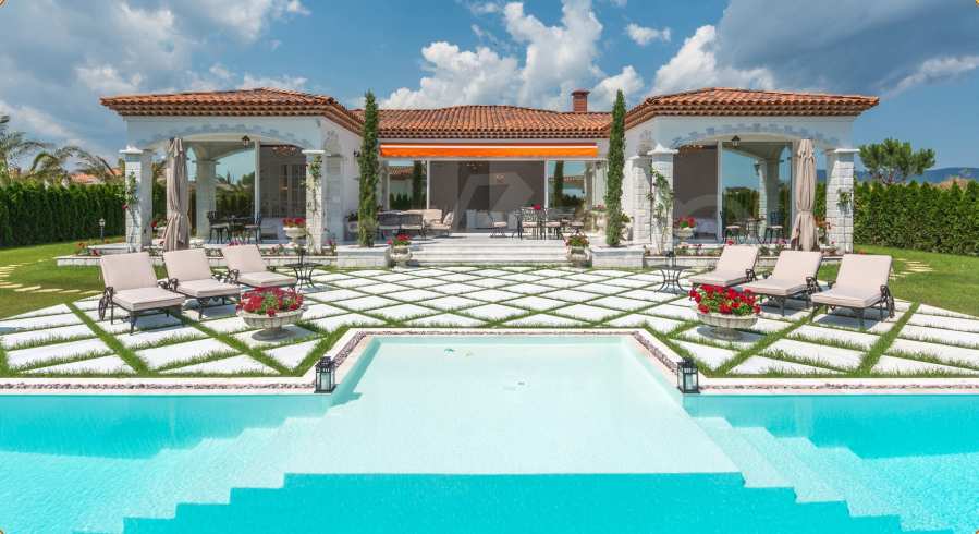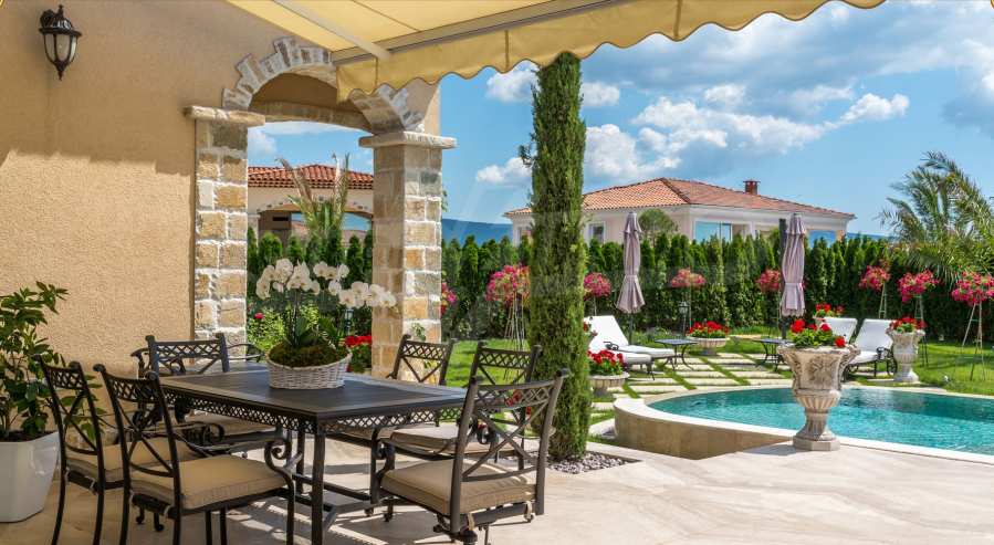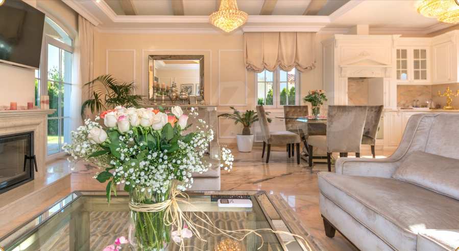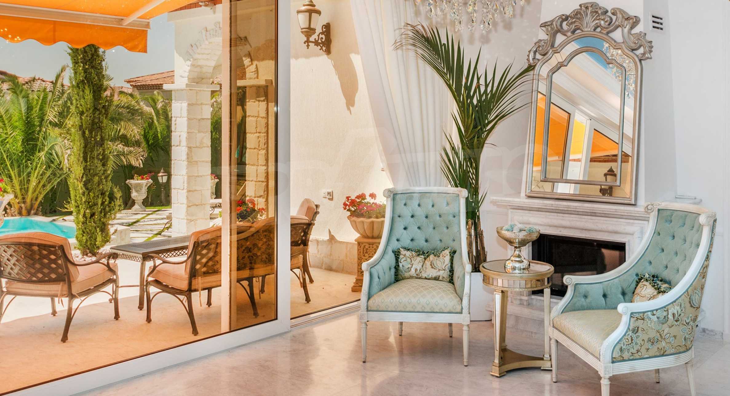 The house is luxuriously furnished, decorated with original stained glass windows with entirely individually made furniture. The interior uses extremely high quality, natural materials, natural marble "Pyrgos Light". Welcoming with a representative entrance, the property offers three double bedrooms with private bathrooms and a closet, an "Open Space" living room with kitchen and dining area, a veranda and a fireplace. The pool is centrally located, lined entirely with natural marble "Pyrgos Light", and the garden is spacious and richly landscaped with exotic trees and flowers.