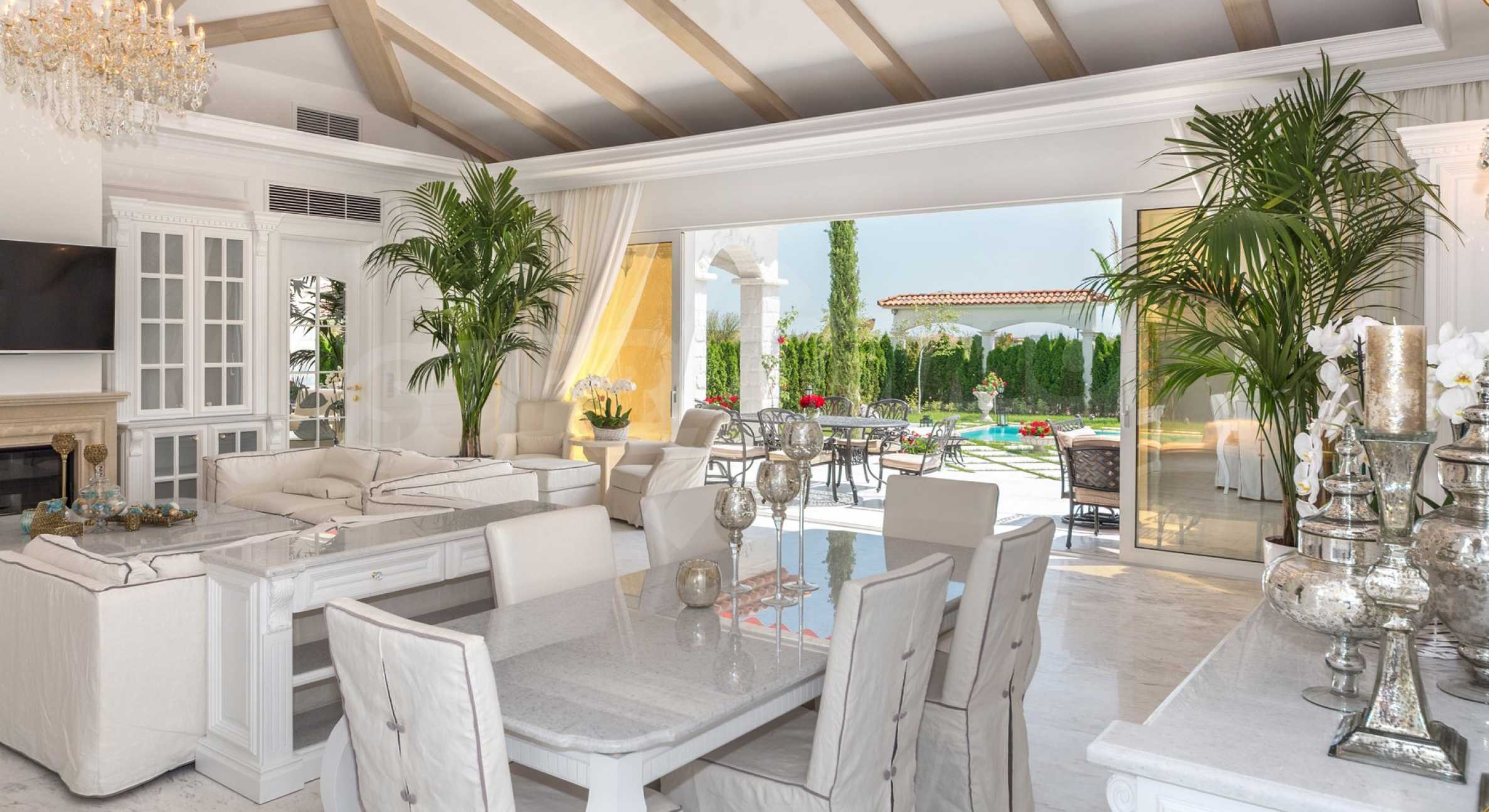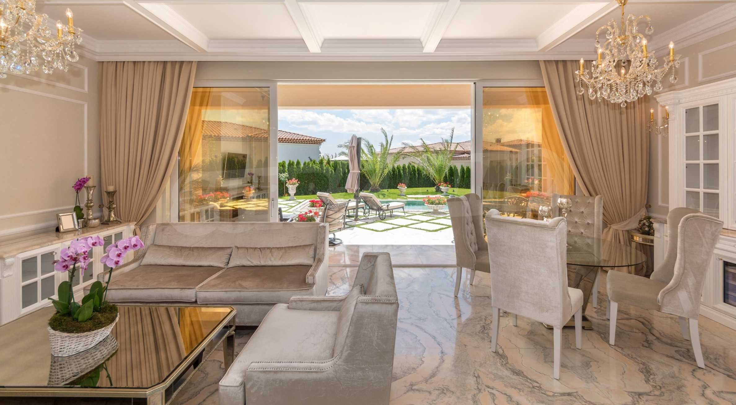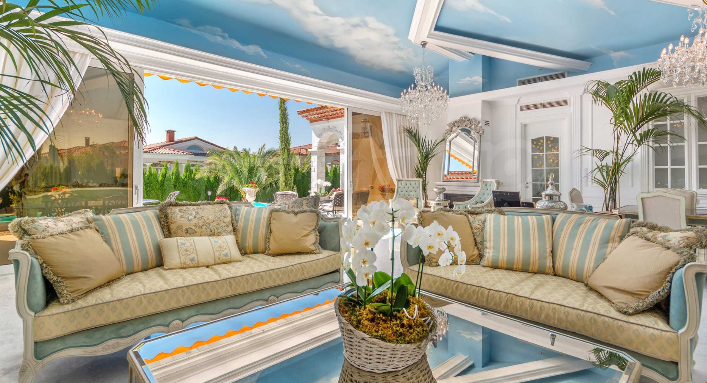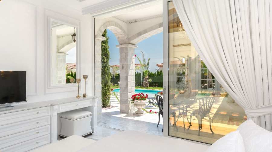 The house is luxuriously furnished, decorated with original stained glass windows with entirely individually made furniture. The interior uses extremely high quality, natural materials, natural marble "Pyrgos Light". Welcoming with a representative entrance, the property offers three double bedrooms with private bathrooms and a closet, an "Open Space" living room with kitchen and dining area, a veranda and a fireplace. The pool is centrally located, lined entirely with natural marble "Pyrgos Light", and the garden is spacious and richly landscaped with exotic trees and flowers.