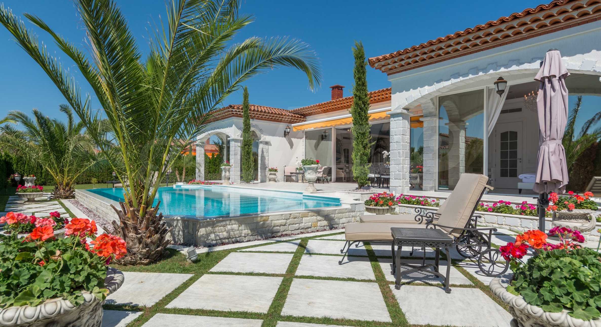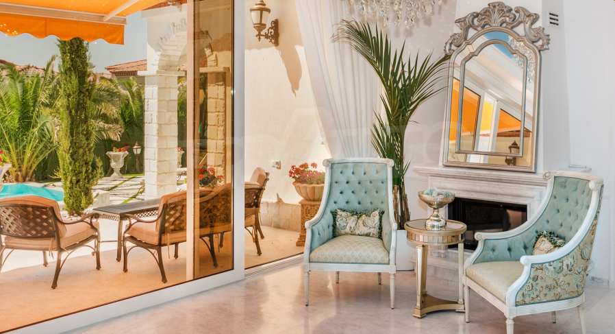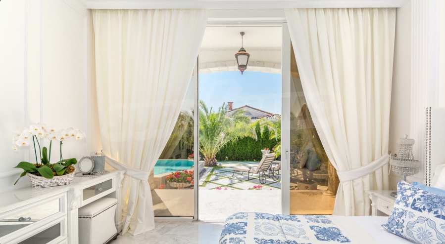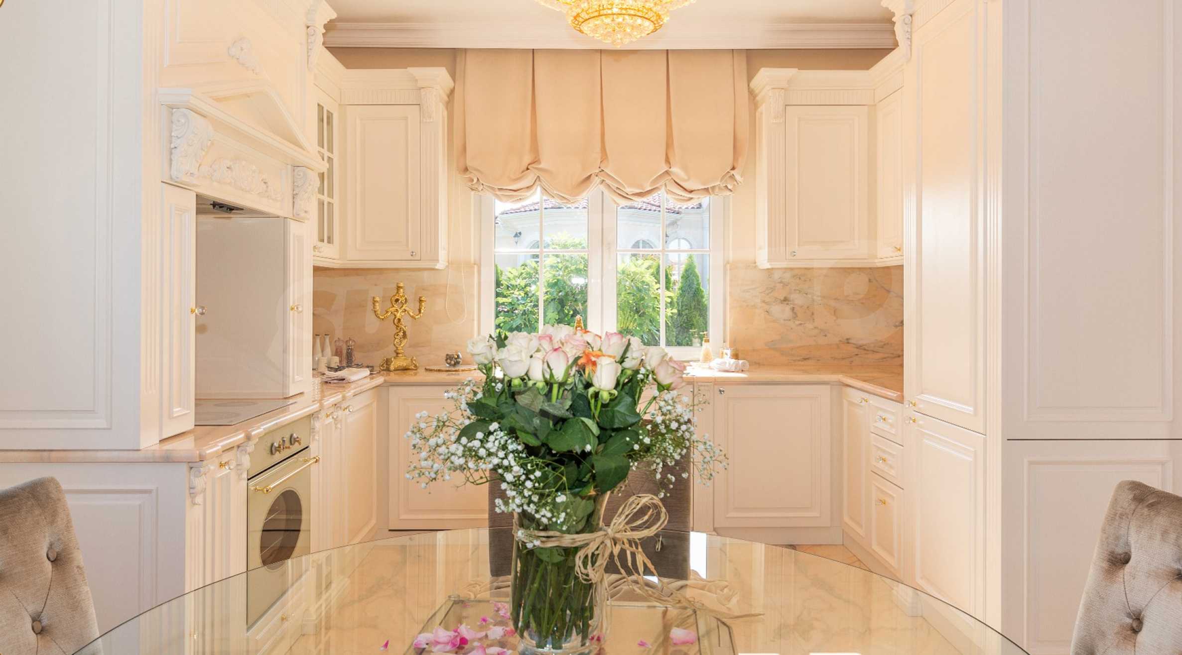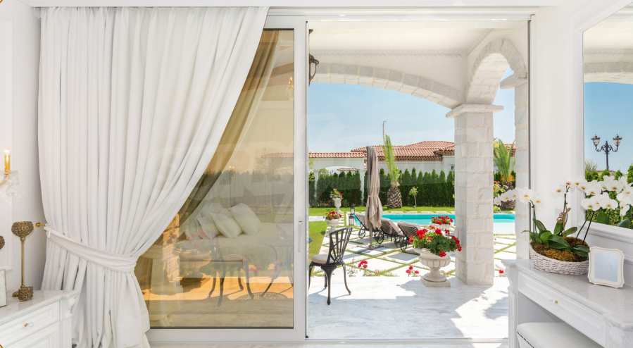 The house is luxuriously furnished, decorated with original stained glass windows with entirely individually made furniture. The interior uses extremely high quality, natural materials, natural marble "Pyrgos Light". Welcoming with a representative entrance, the property offers three double bedrooms with private bathrooms and a closet, an "Open Space" living room with kitchen and dining area, a veranda and a fireplace. The pool is centrally located, lined entirely with natural marble "Pyrgos Light", and the garden is spacious and richly landscaped with exotic trees and flowers.