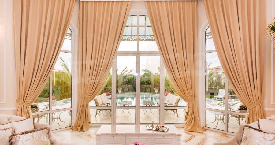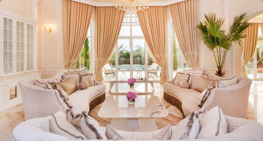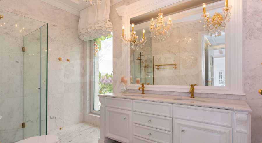Centrally located in the courtyard is a swimming pool, completely lined with marble, surrounded by a garden planted with exotic trees and flowers, with separate areas for sun loungers around the pool.