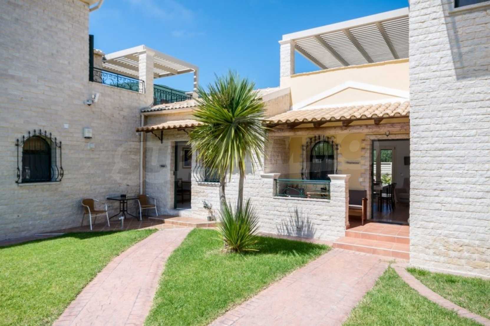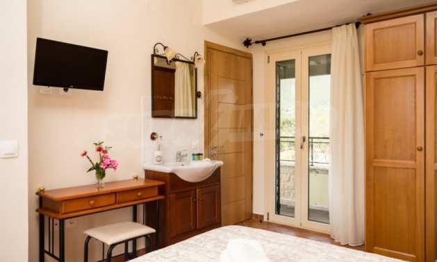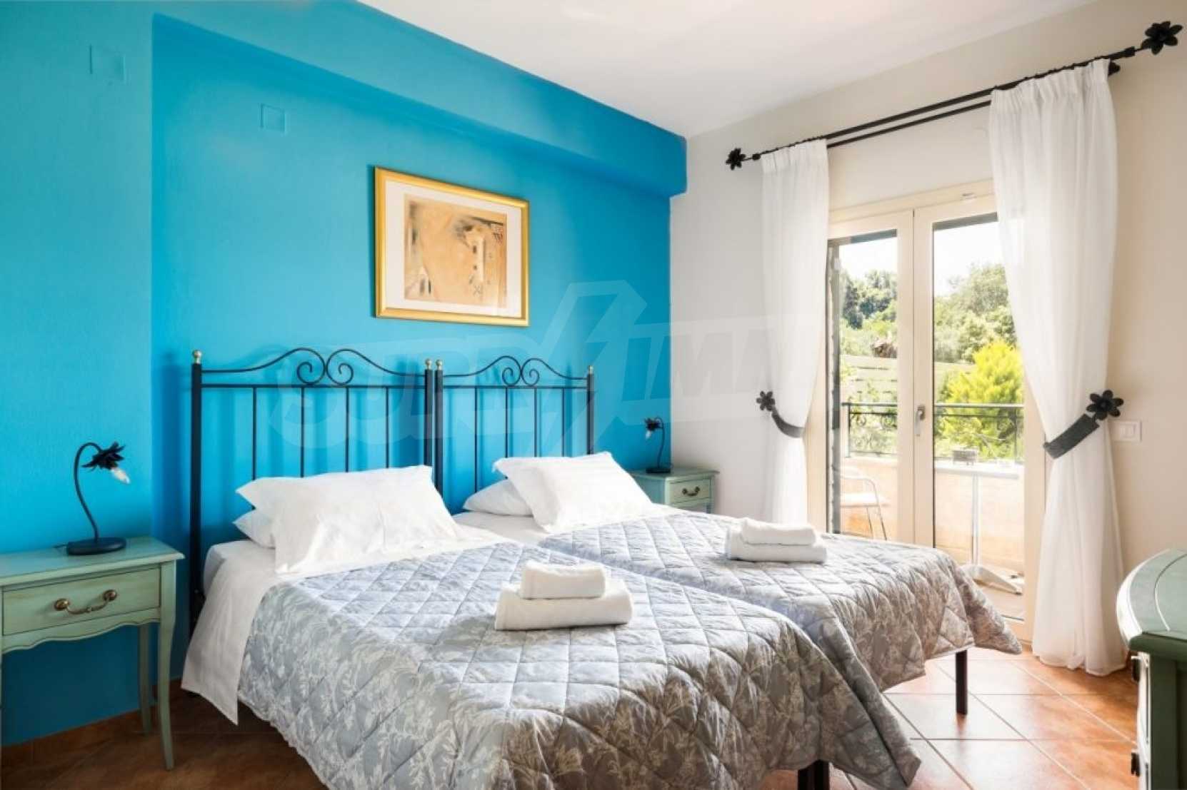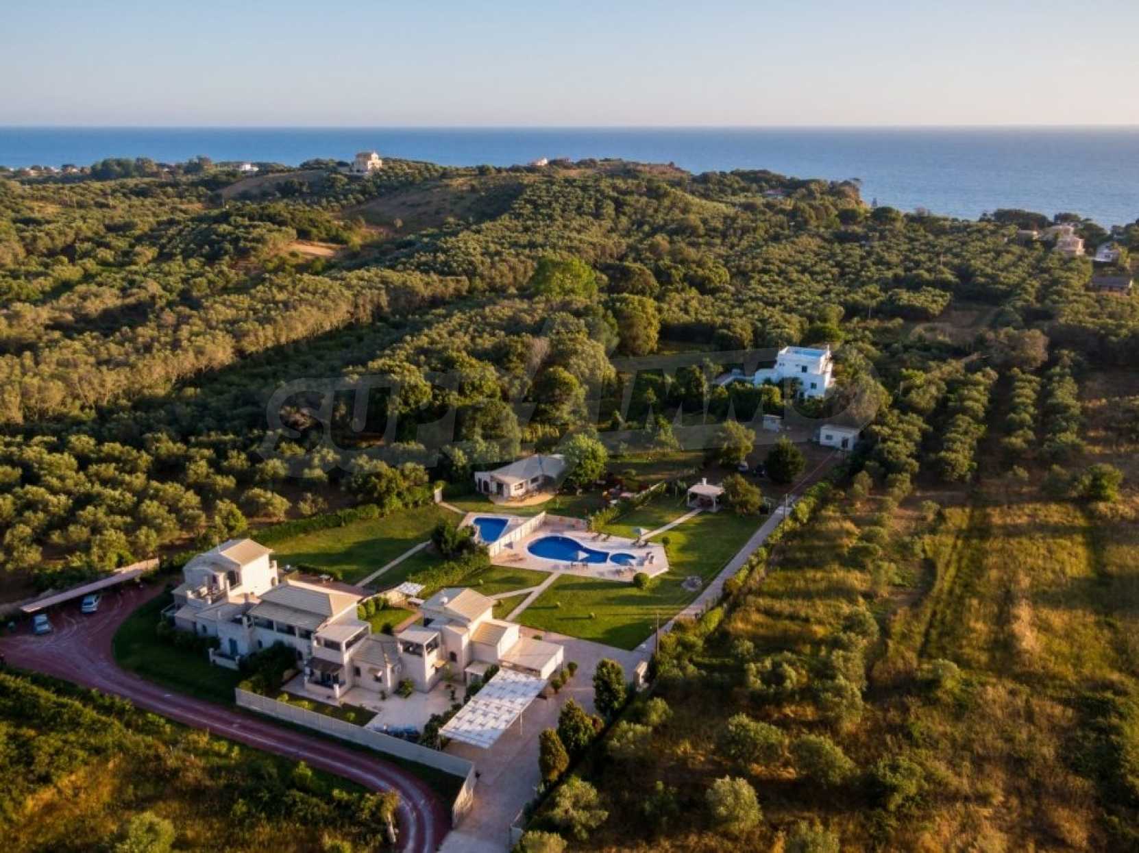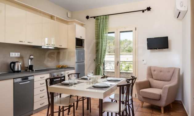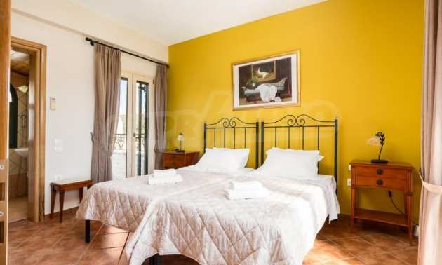 In a privileged position surrounded by nature and at close distance from the crystal blue waters of the Ionian Sea, this villa dominates. Nestled in a beautiful, unspoilt location in the area of Chalikounas, at close distance from Korission Lake, which hosts many rare species of flora and fauna.The villa is divided into three stone built houses, totaling 194 sqm on a plot of 3.530 sqm.The first house has an open plan kitchen/dining room, a bedroom with two single beds and a bathroom. The first level has one more bedroom with a double bed.