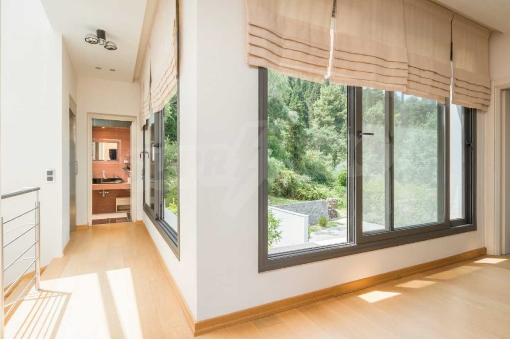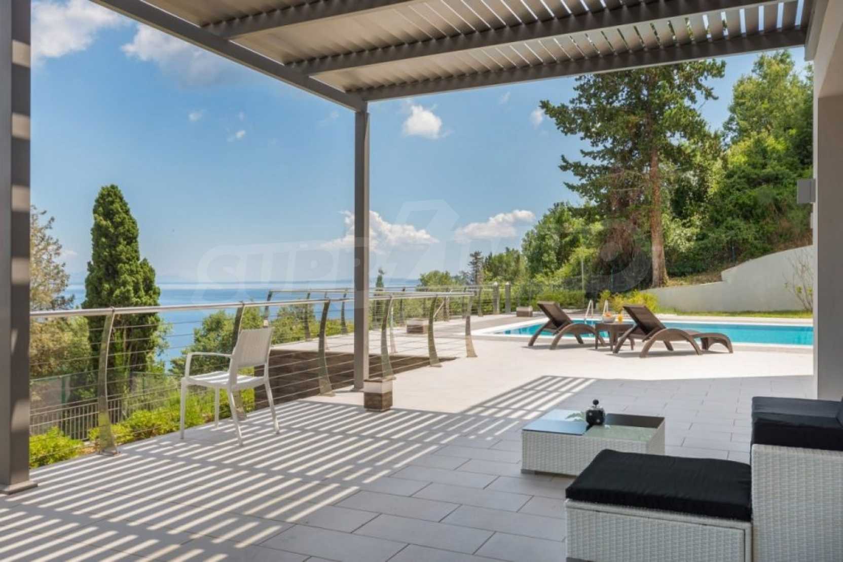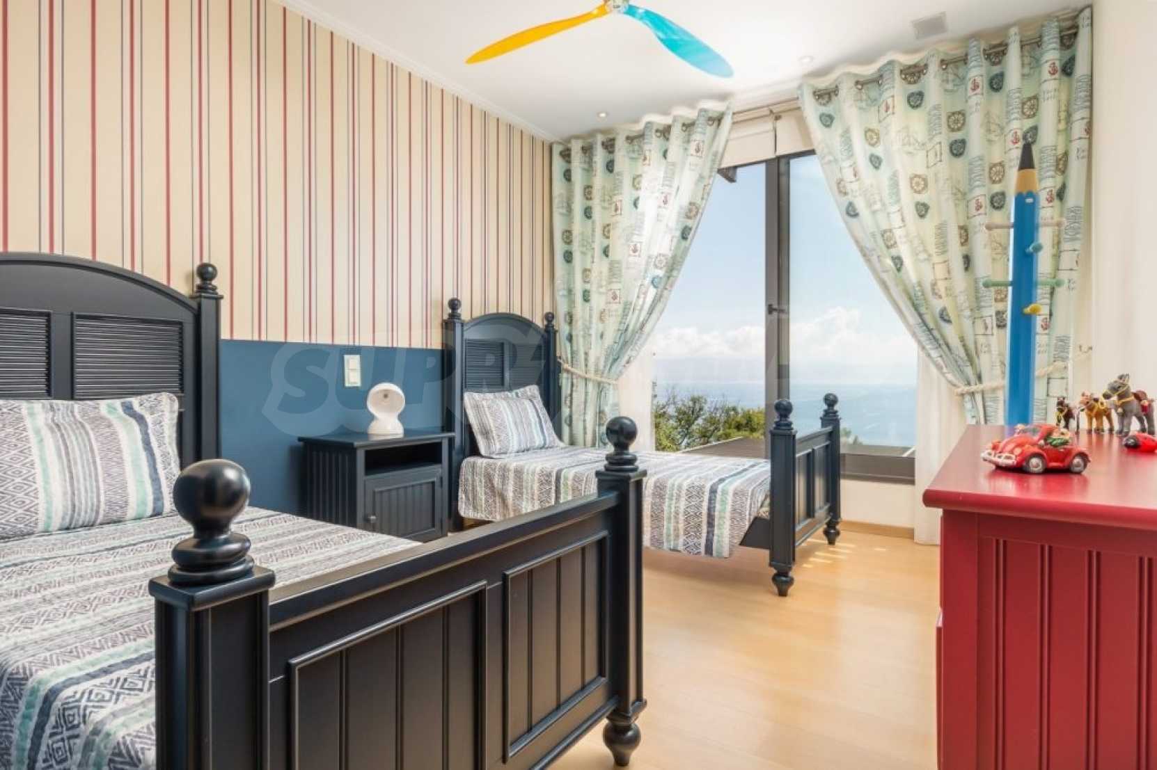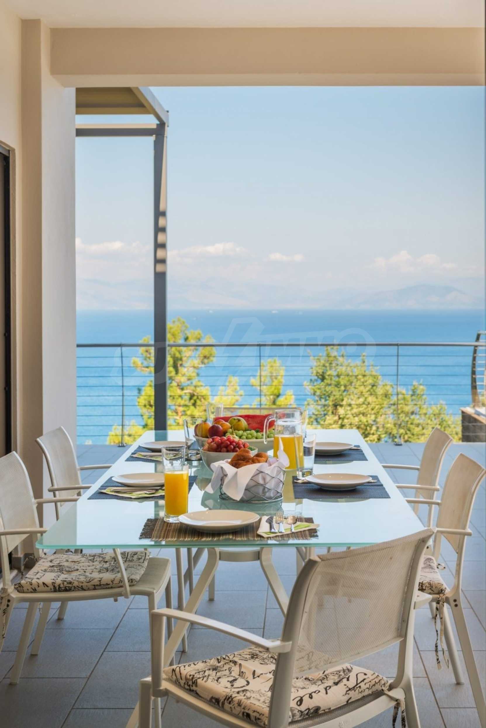 The first floor measures 151.2 sqm and consists of an anteroom, a spacious living room with a fireplace, a dining area, a fully equipped kitchen with kitchen utility room and a guest bathroom. The large veranda of 73.5 sqm with the outdoor dining area, provides mesmerizing views to the emerald waters of Ionian Sea. There is also an open decorative area featuring a reflection basin.