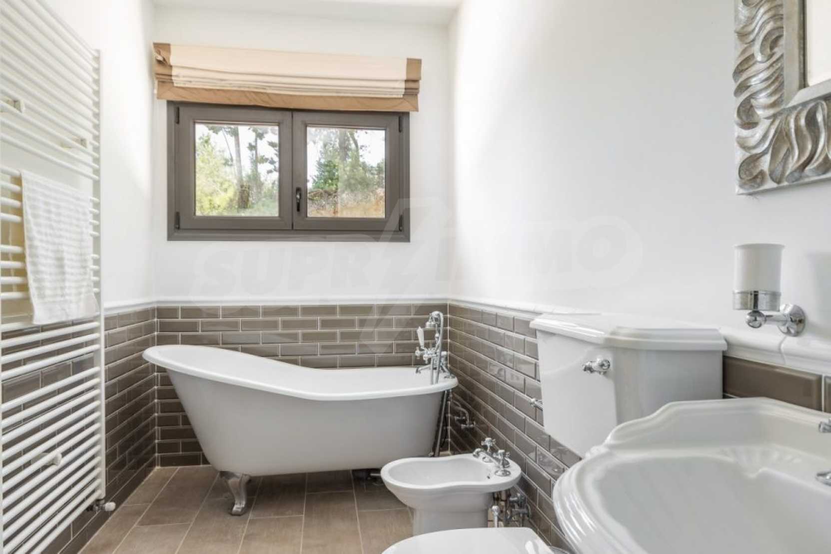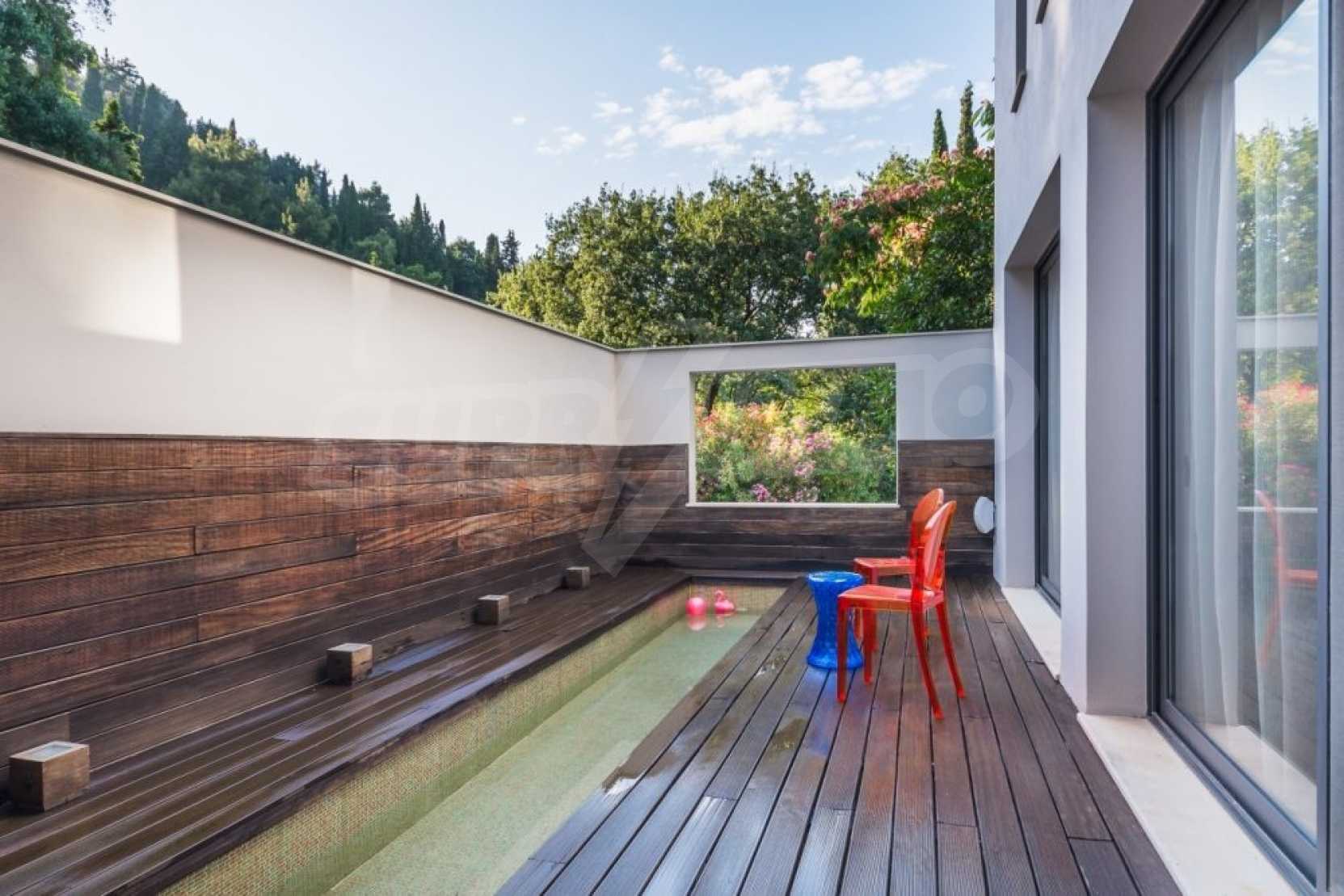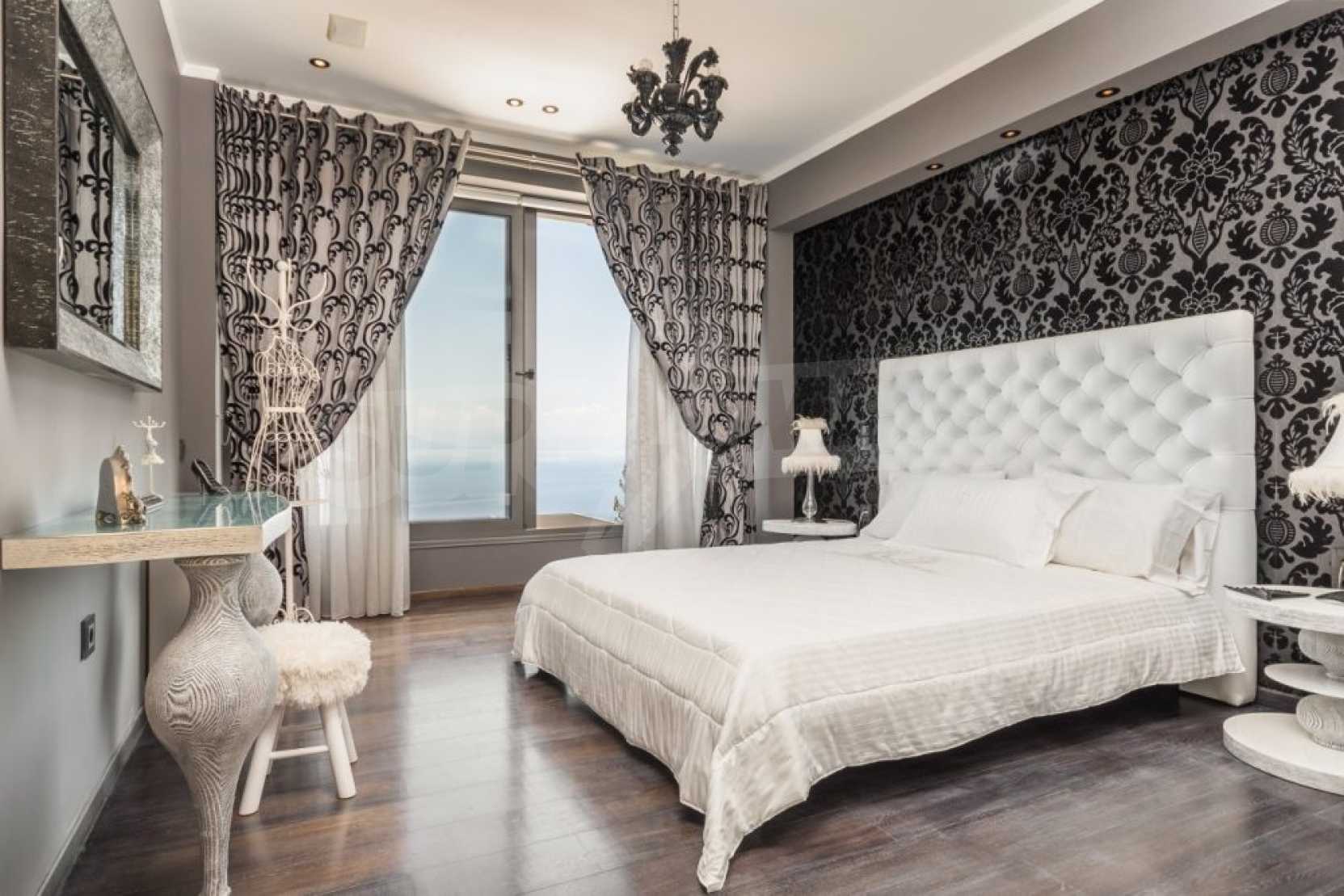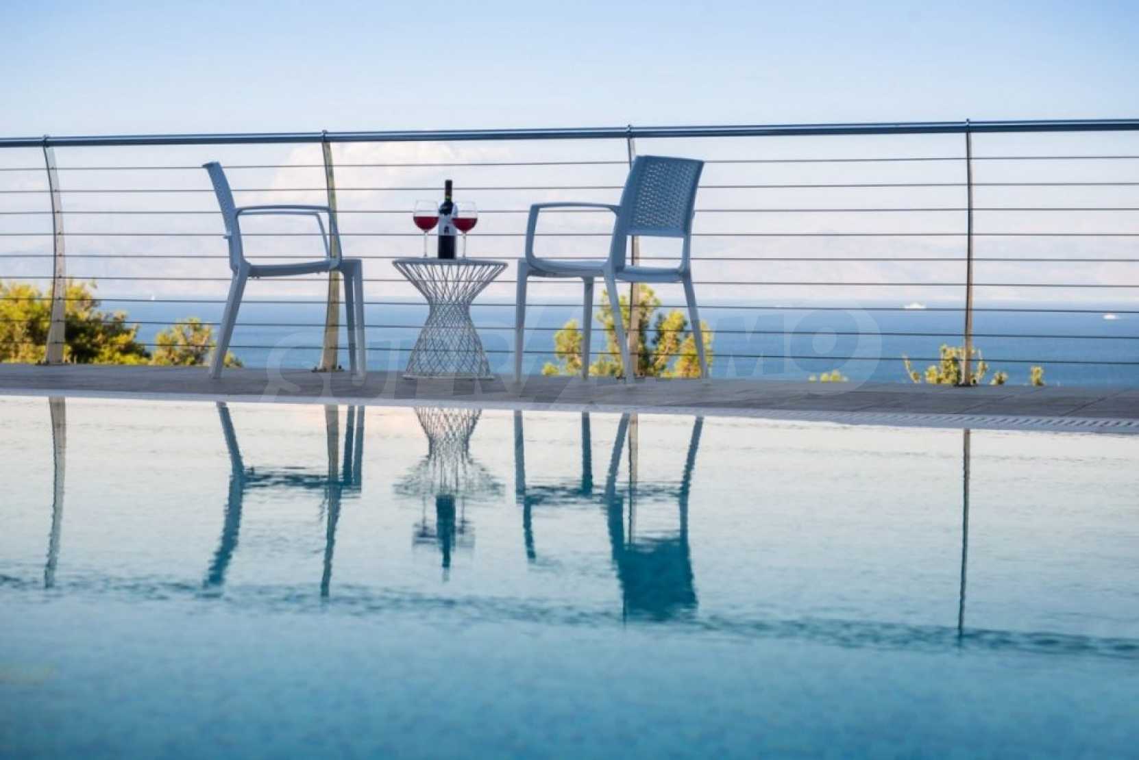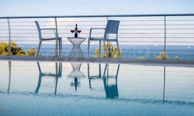 The first floor measures 151.2 sqm and consists of an anteroom, a spacious living room with a fireplace, a dining area, a fully equipped kitchen with kitchen utility room and a guest bathroom. The large veranda of 73.5 sqm with the outdoor dining area, provides mesmerizing views to the emerald waters of Ionian Sea. There is also an open decorative area featuring a reflection basin.