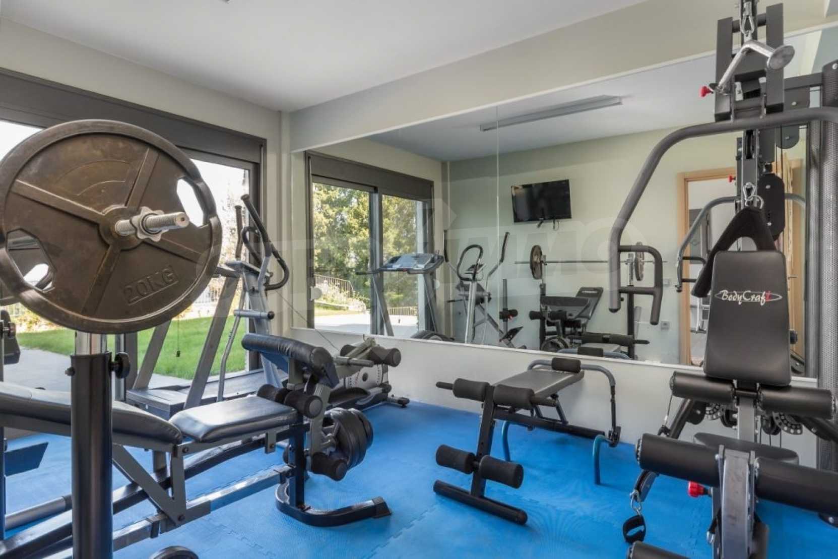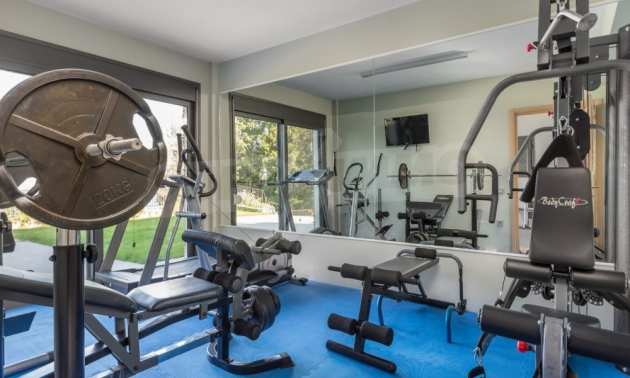 The ground floor measures 217 sqm and consists of a guest bedroom with a hall and a bathroom, a gym, a laundry room, a utility room and a two car garage.