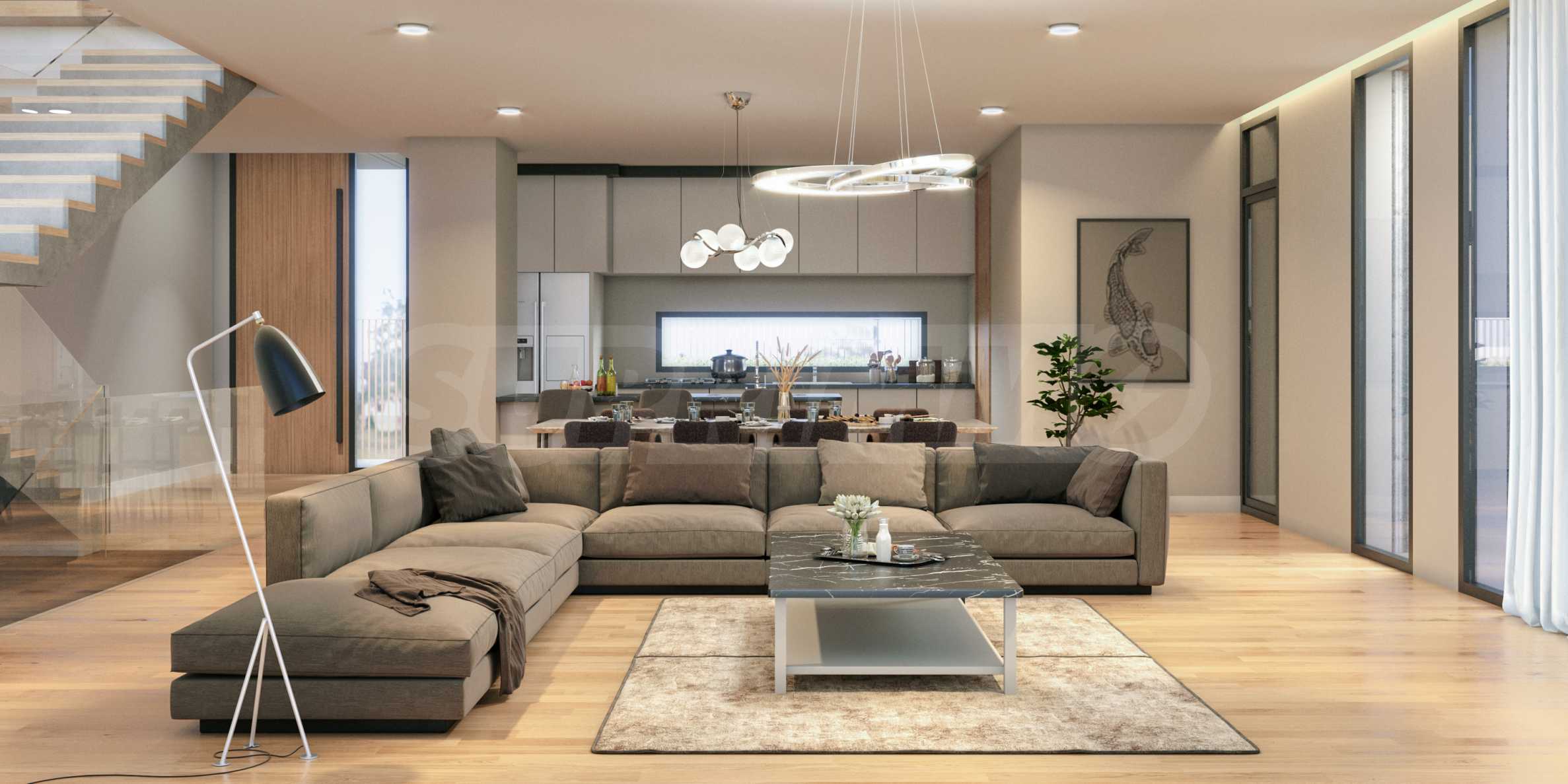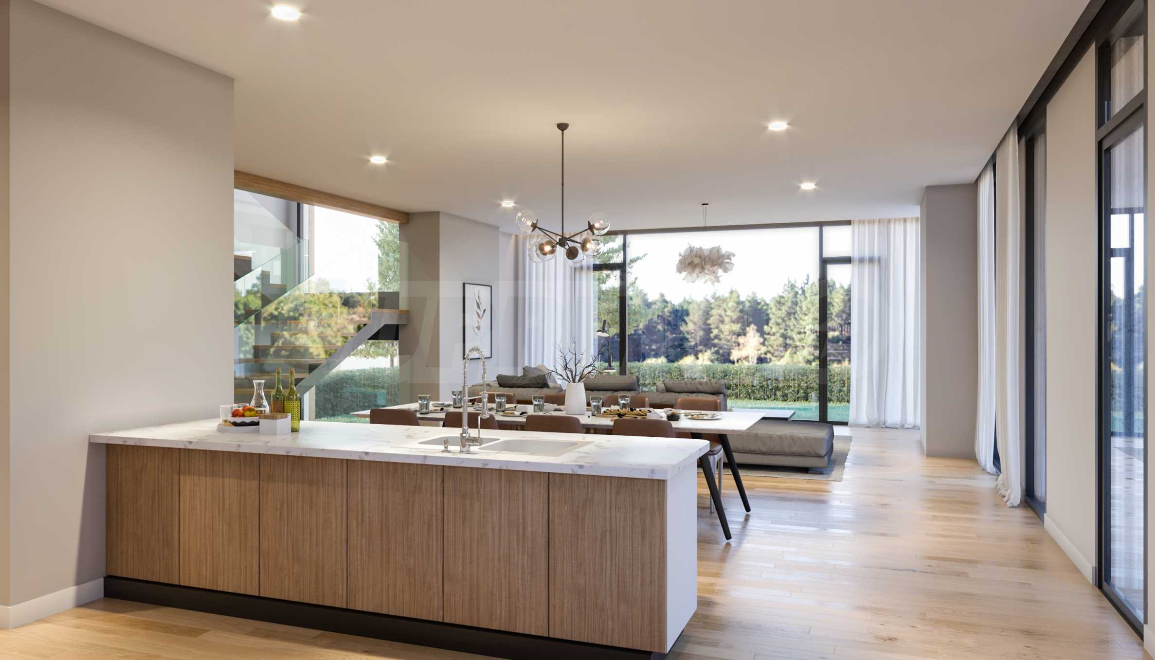 The property is harmoniously integrated into the surrounding nature - minimalism in design, earthy colors, natural materials and absolute comfort of the interior areas, we can boldly say that this is the so-called eco-urban chic. The interior offers open spaces, a feeling of spaciousness and light.