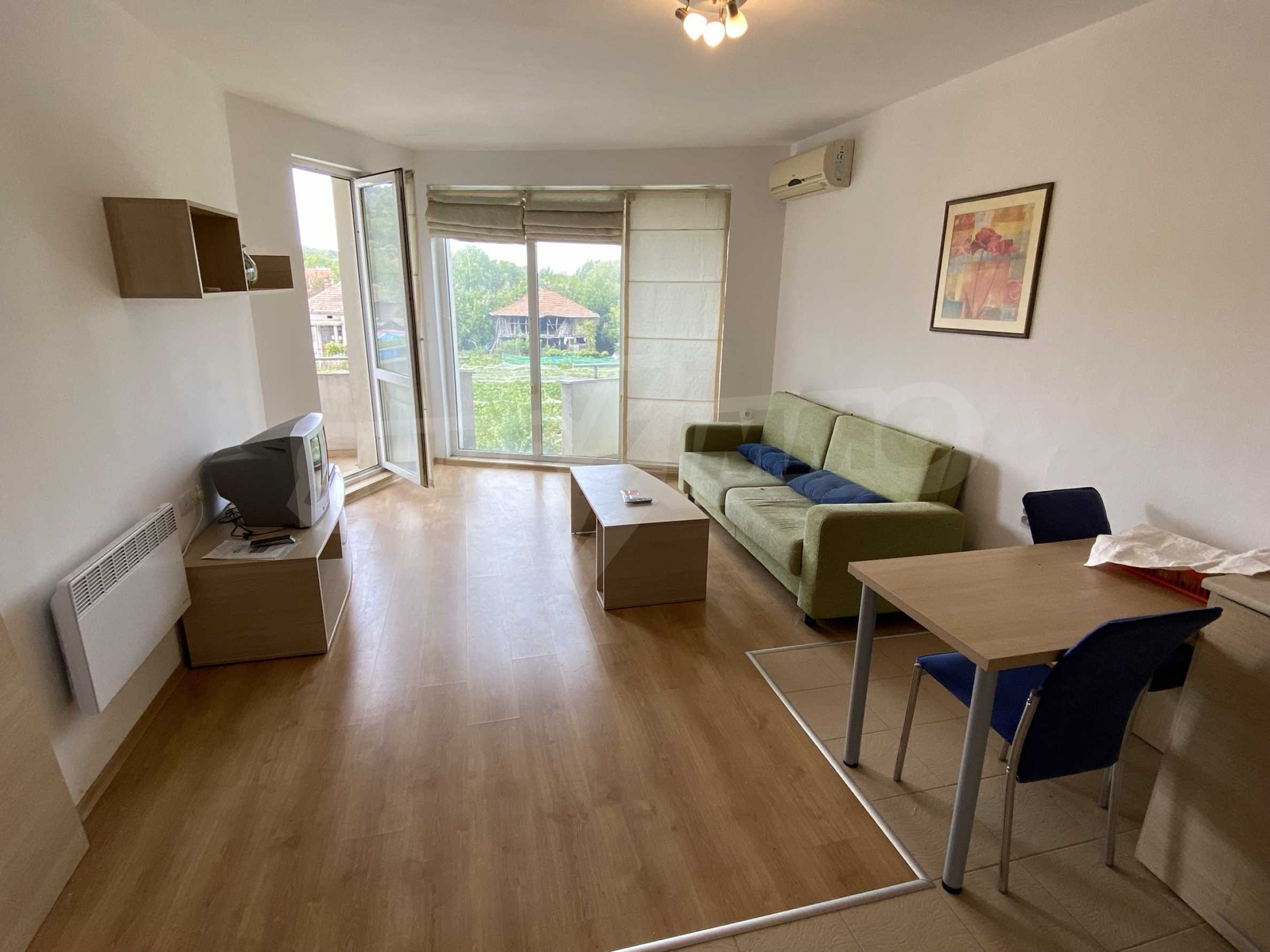 The flat has an area of 88.98 sq.m., located on the third floor. The distribution is as follows: kitchenette with dining area, living room, two bedrooms, and a bathroom. The three rooms open onto the terrace, which offers a beautiful view of the river. The apartment has latex walls, laminate flooring, windows with PVC windows. Heating and cooling are by inverter air conditioners. The flat is furnished and equipped with everything necessary for a comfortable life.